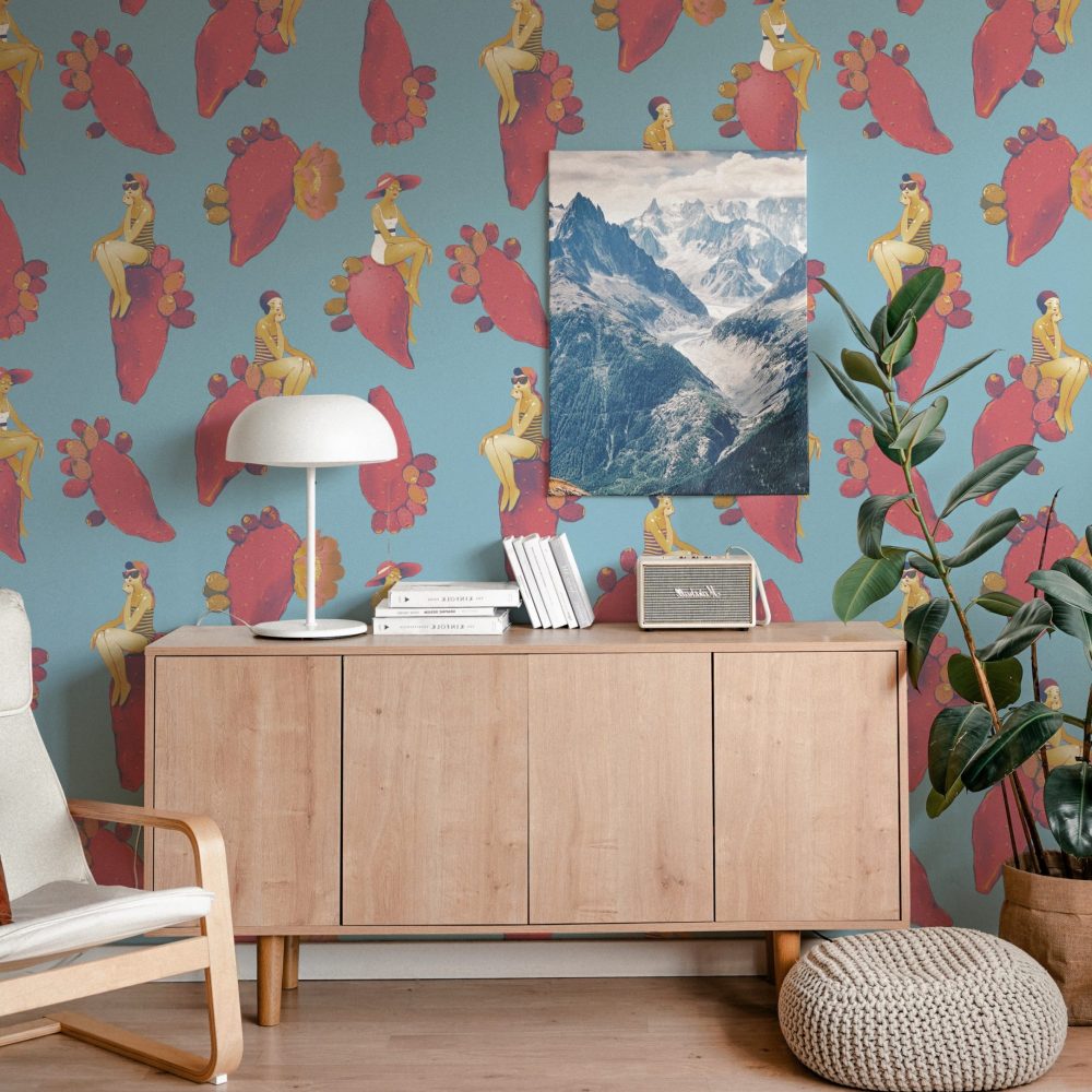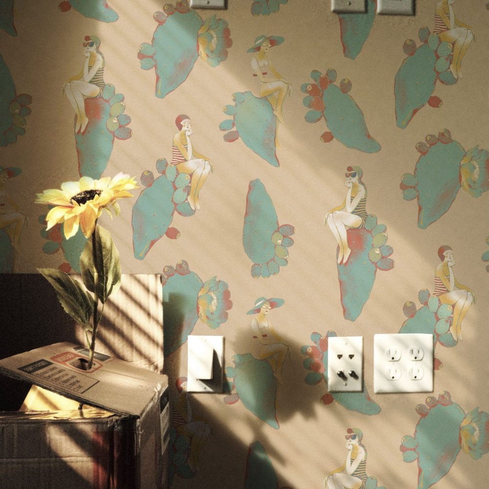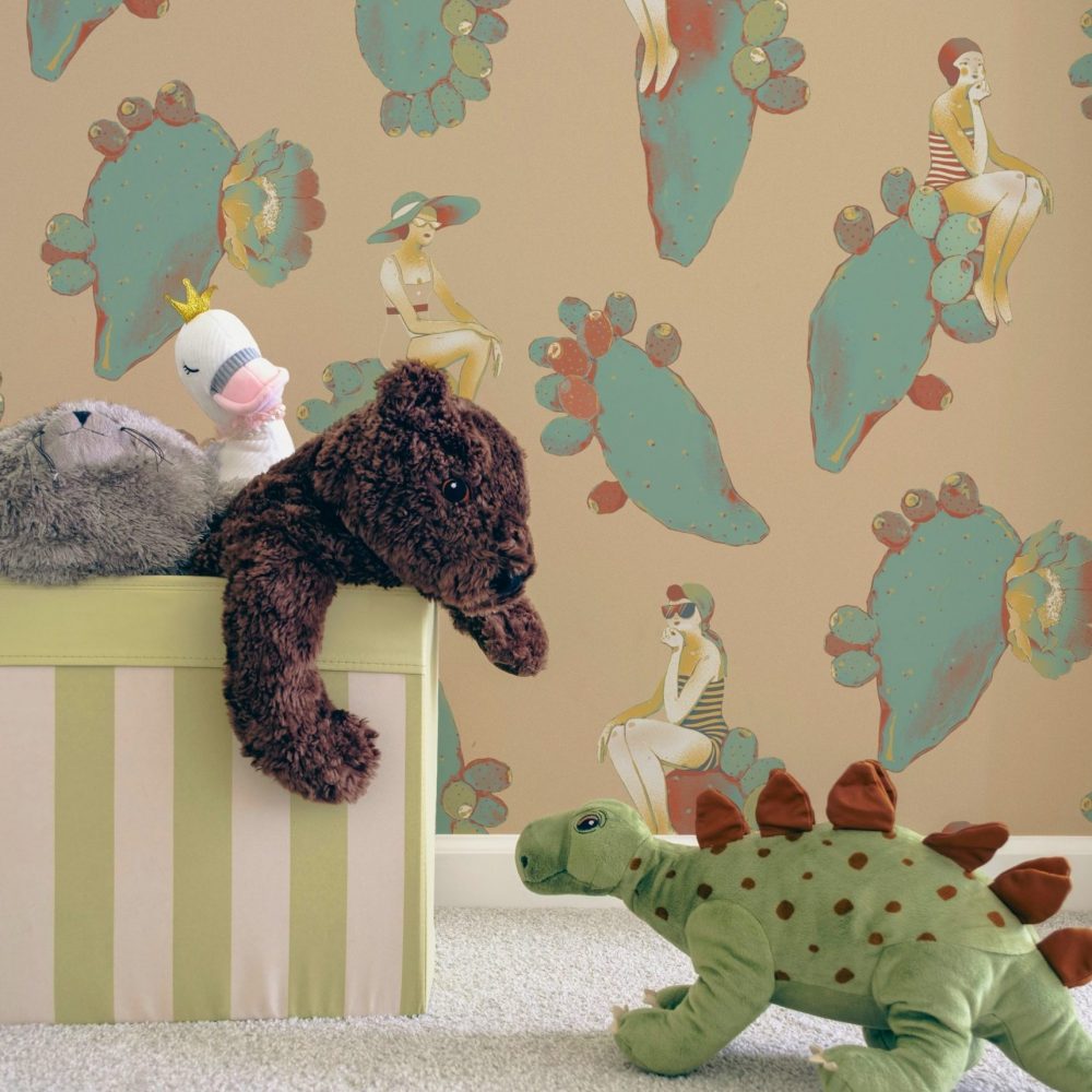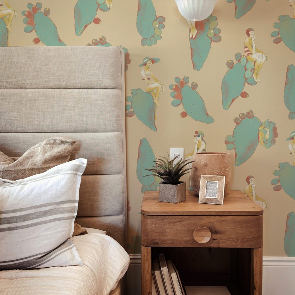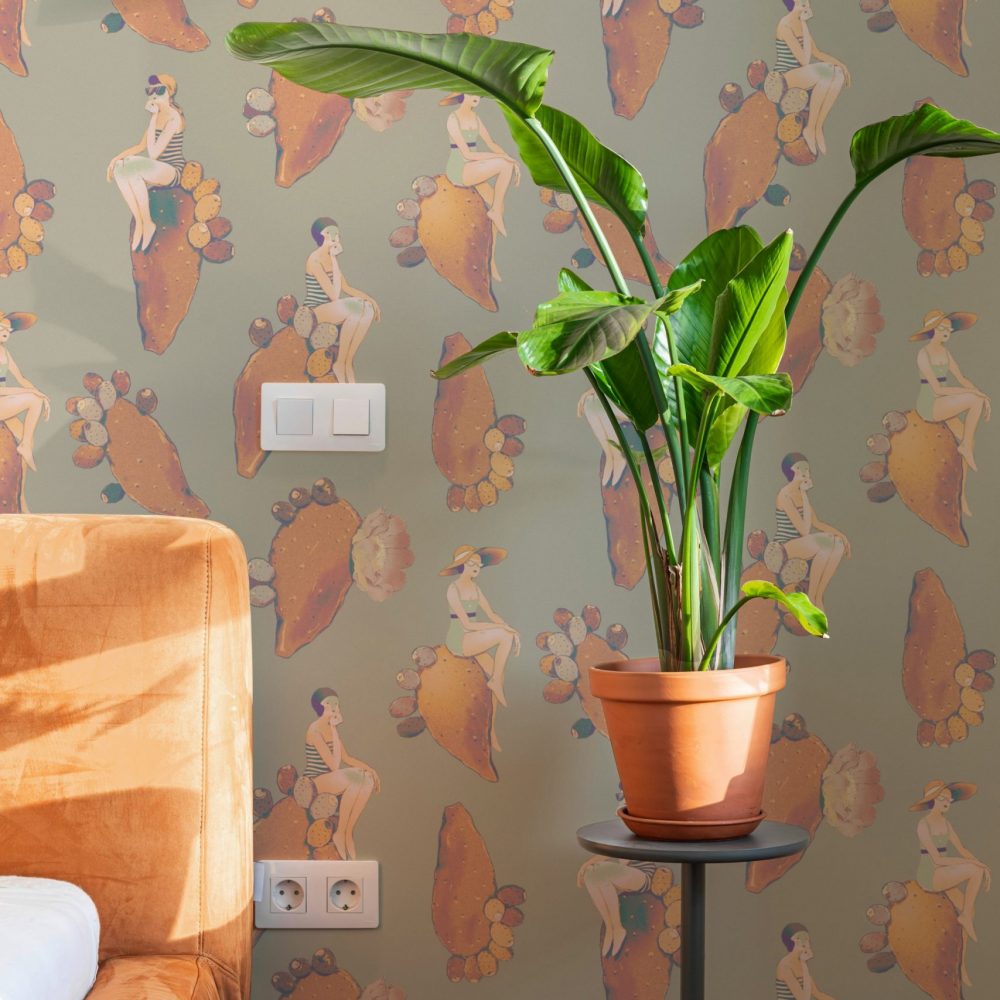 Questo design dalle sfumature delicate vi riporterà al mare del sud, con fanciulle vestite à la mode appoggiate su pale di fichi d’india fluttuanti.