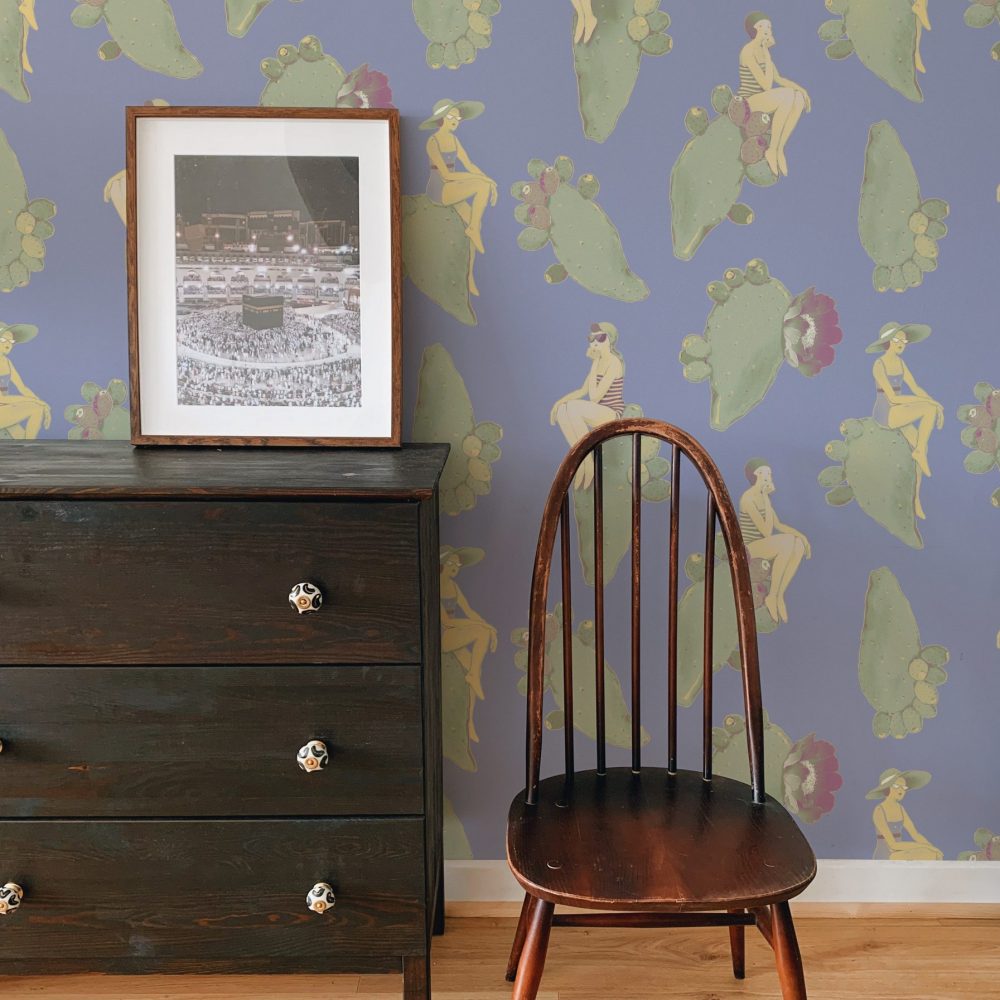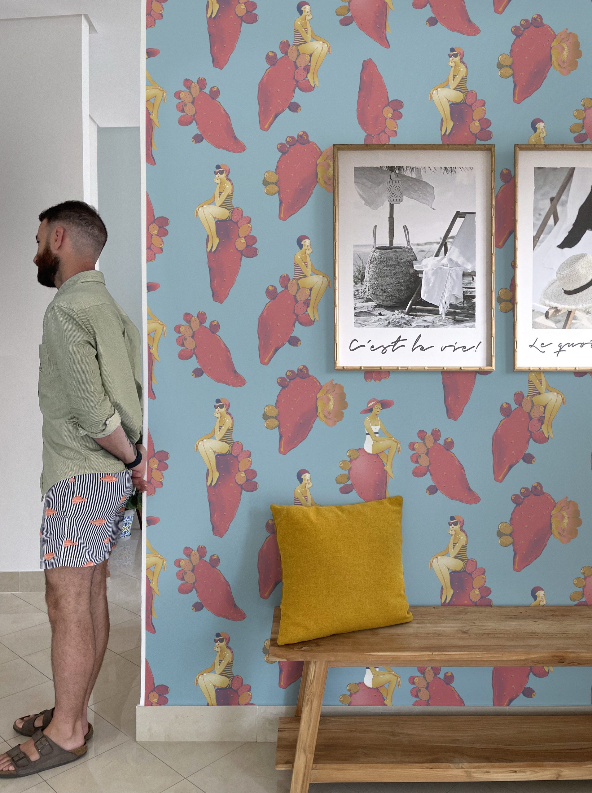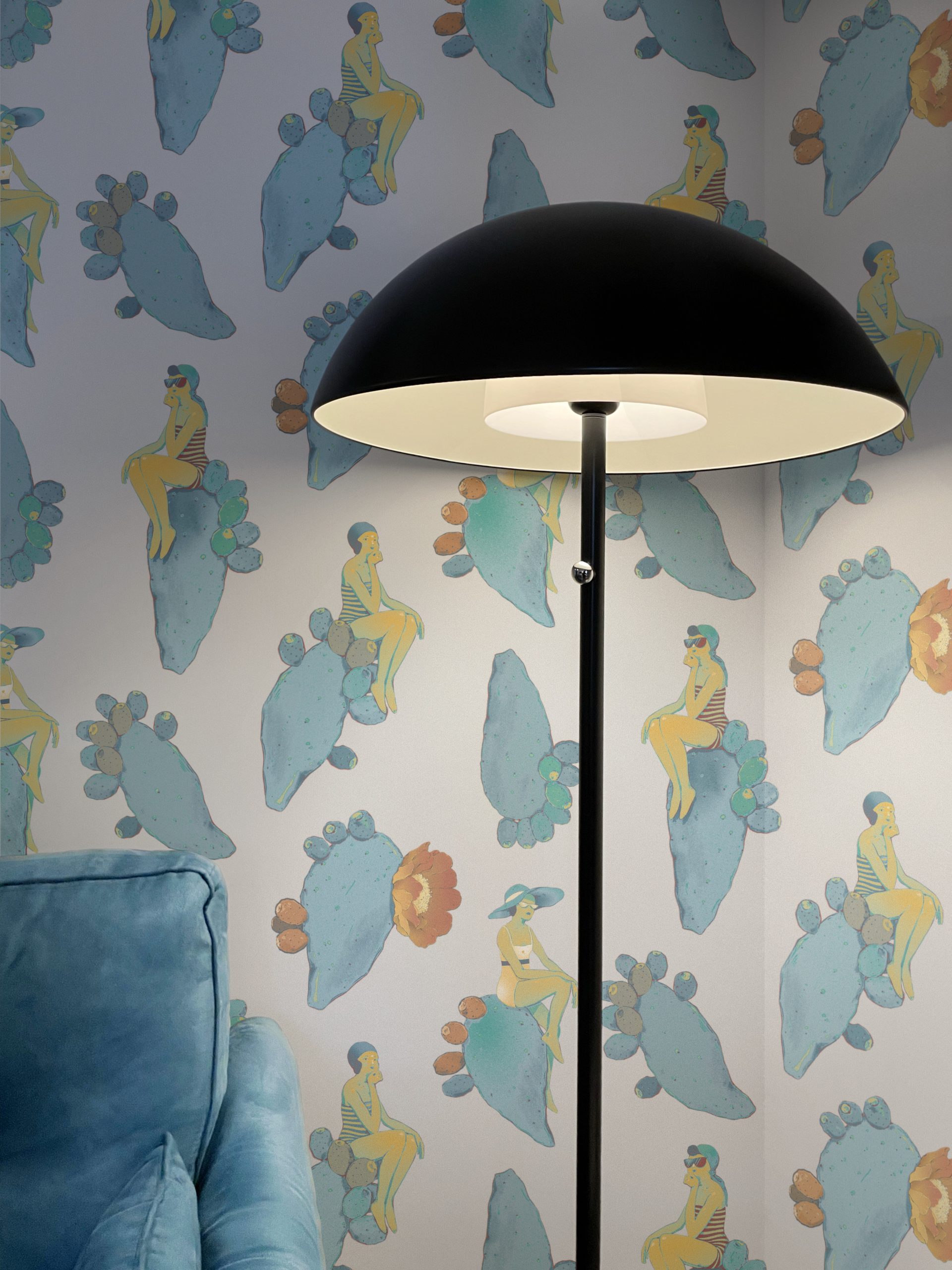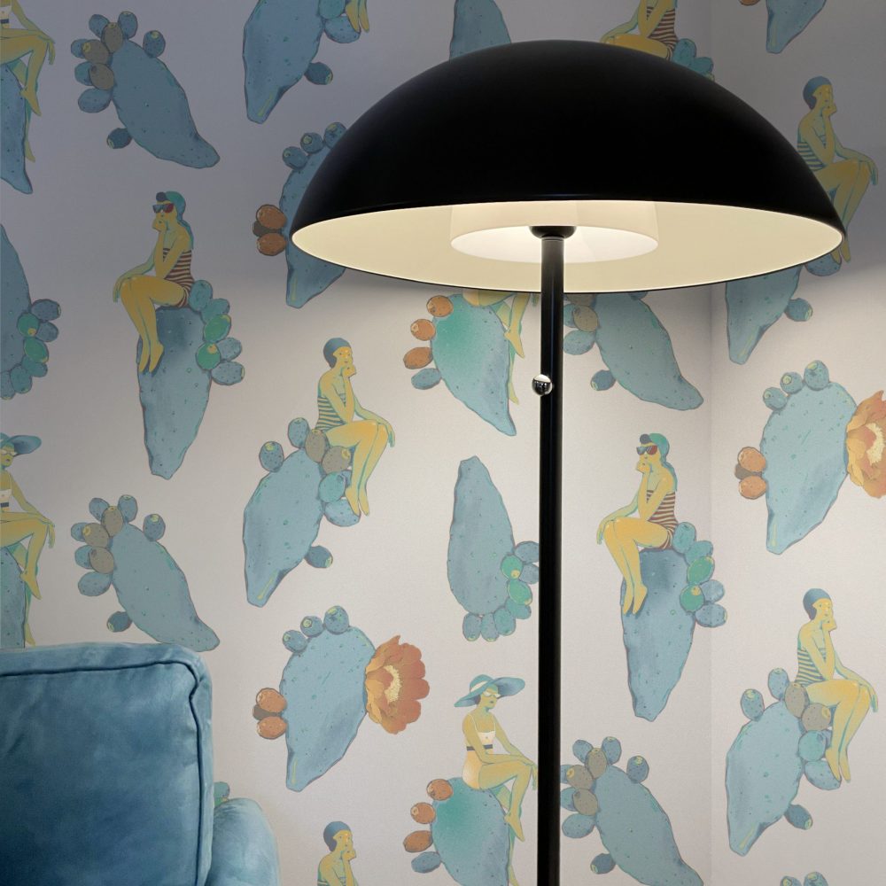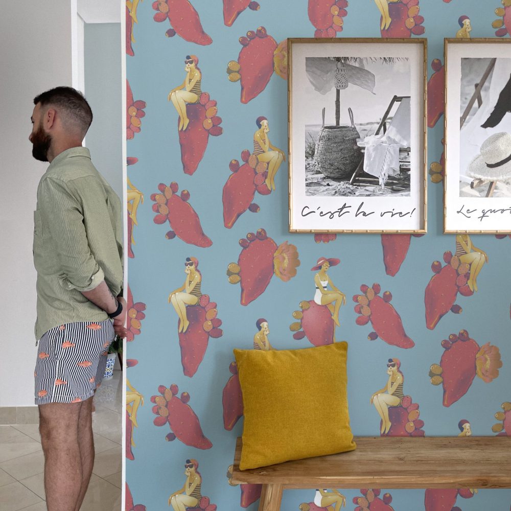 Questo design dalle sfumature delicate vi riporterà al mare del sud, con fanciulle vestite à la mode appoggiate su pale di fichi d’india fluttuanti.