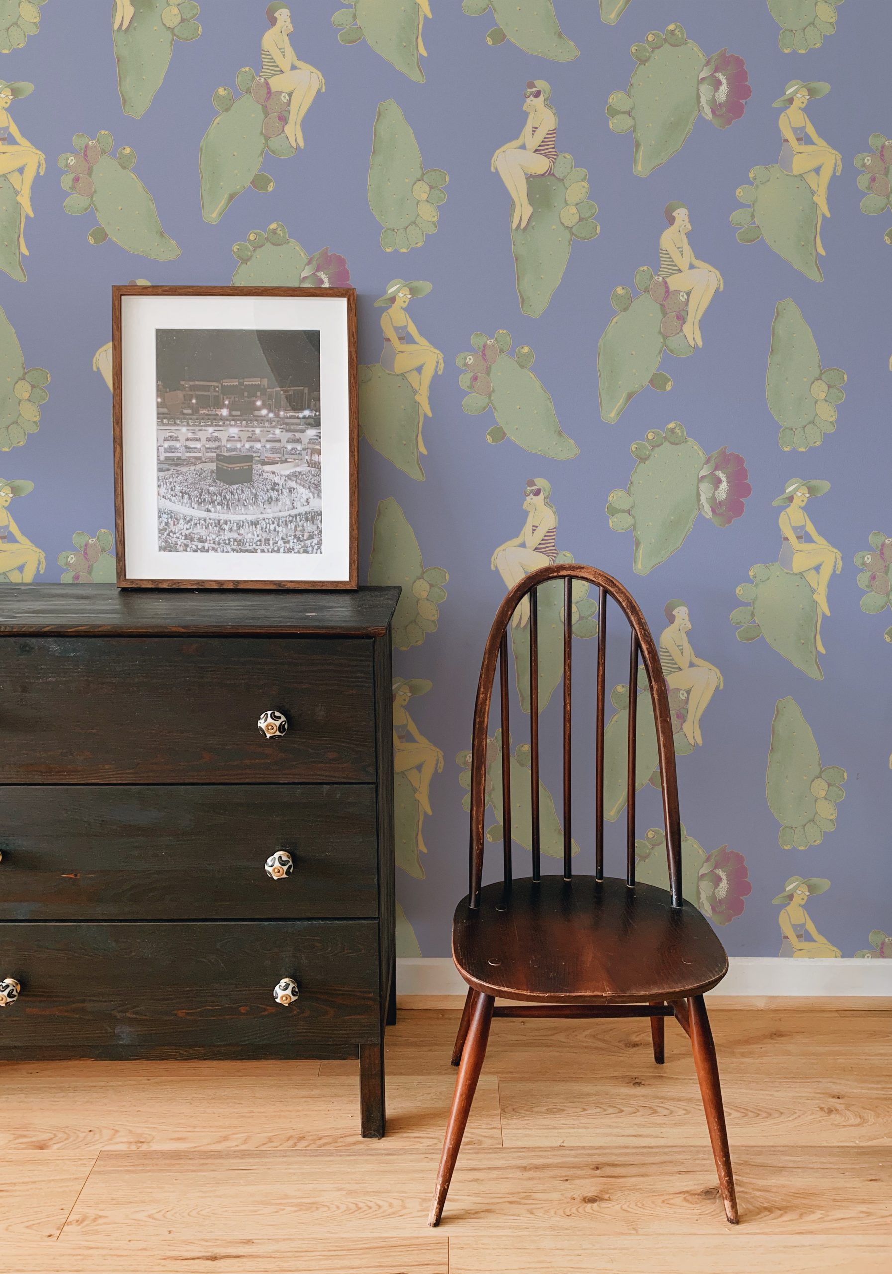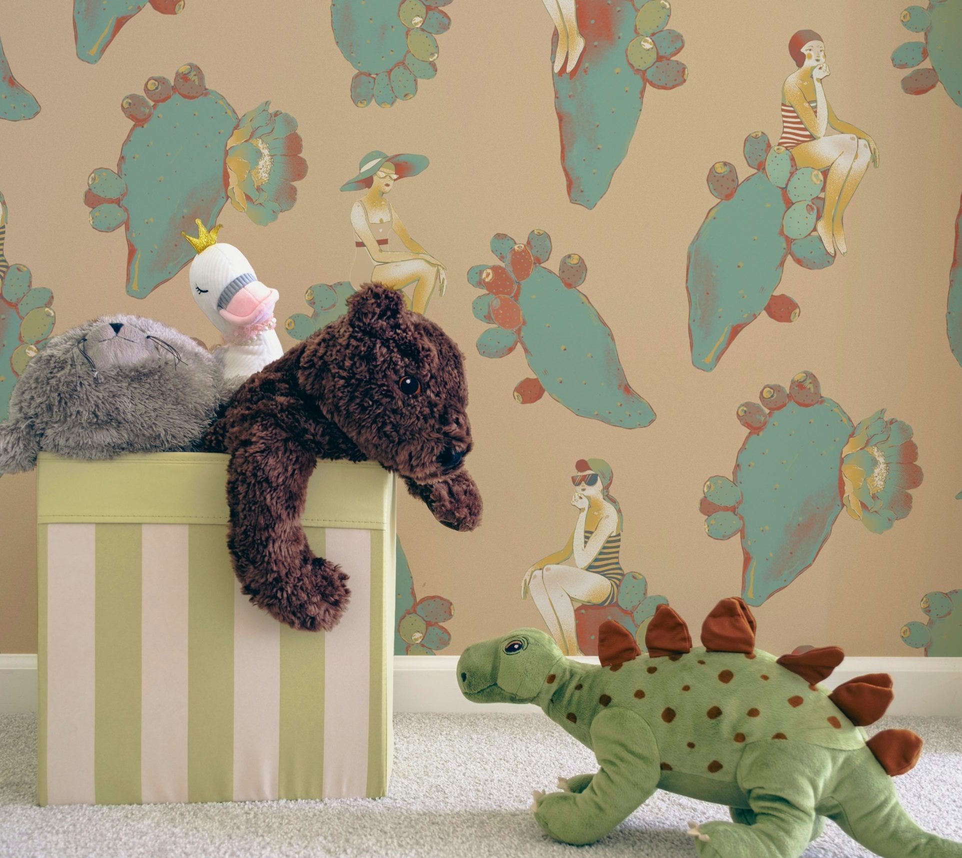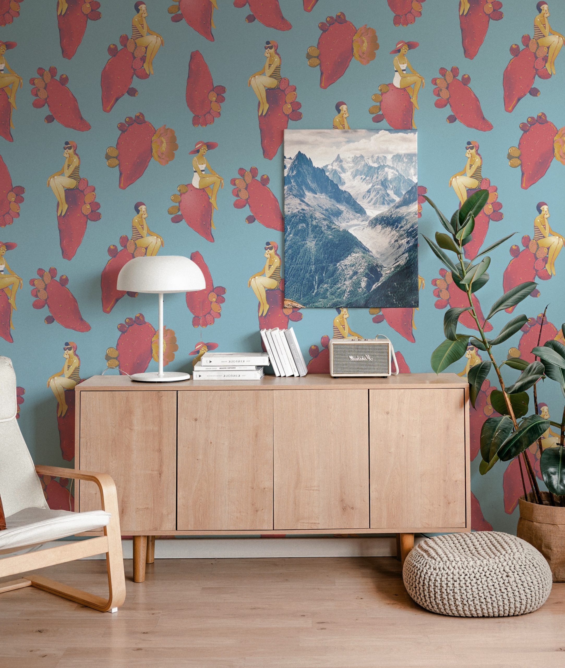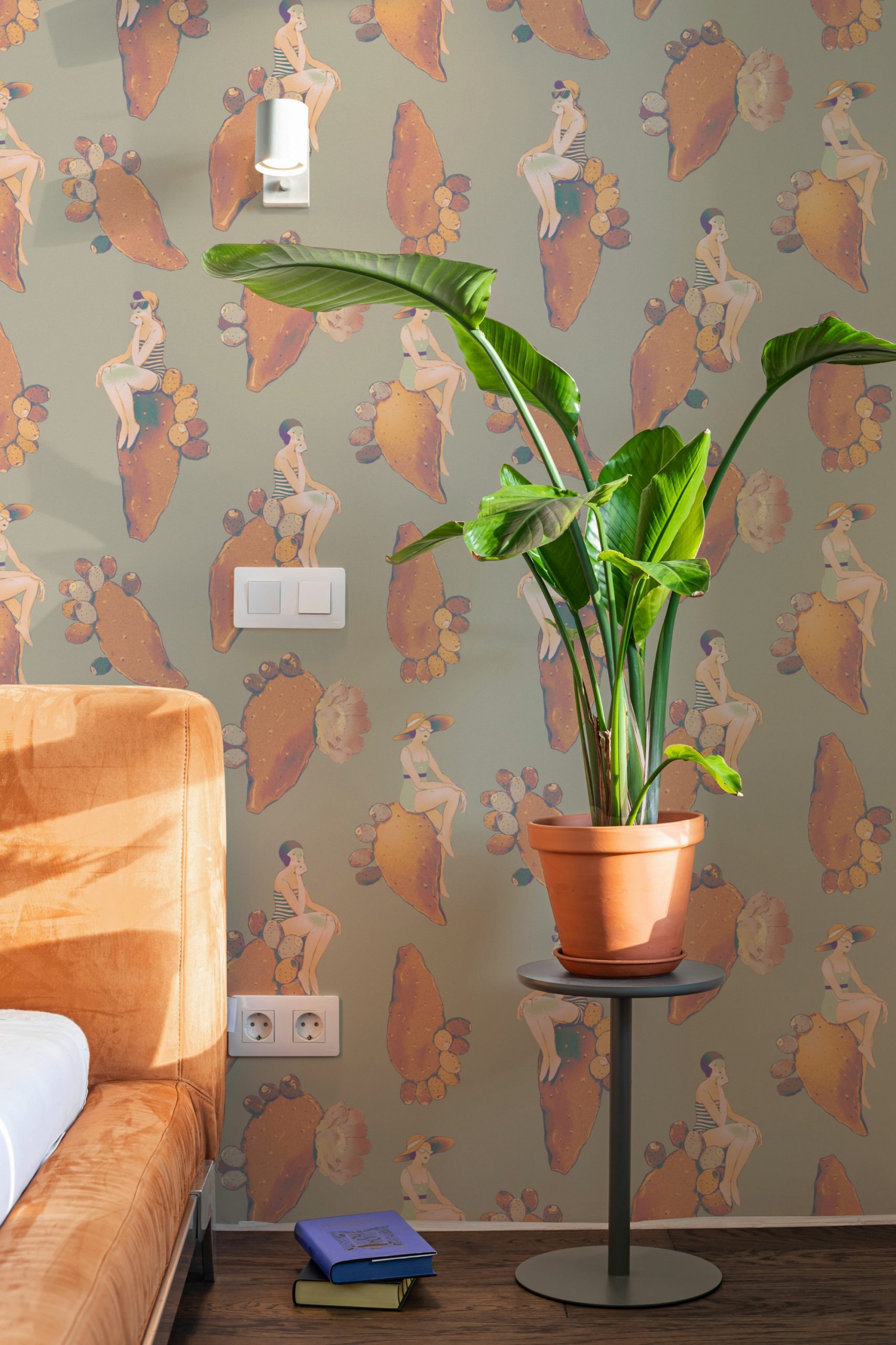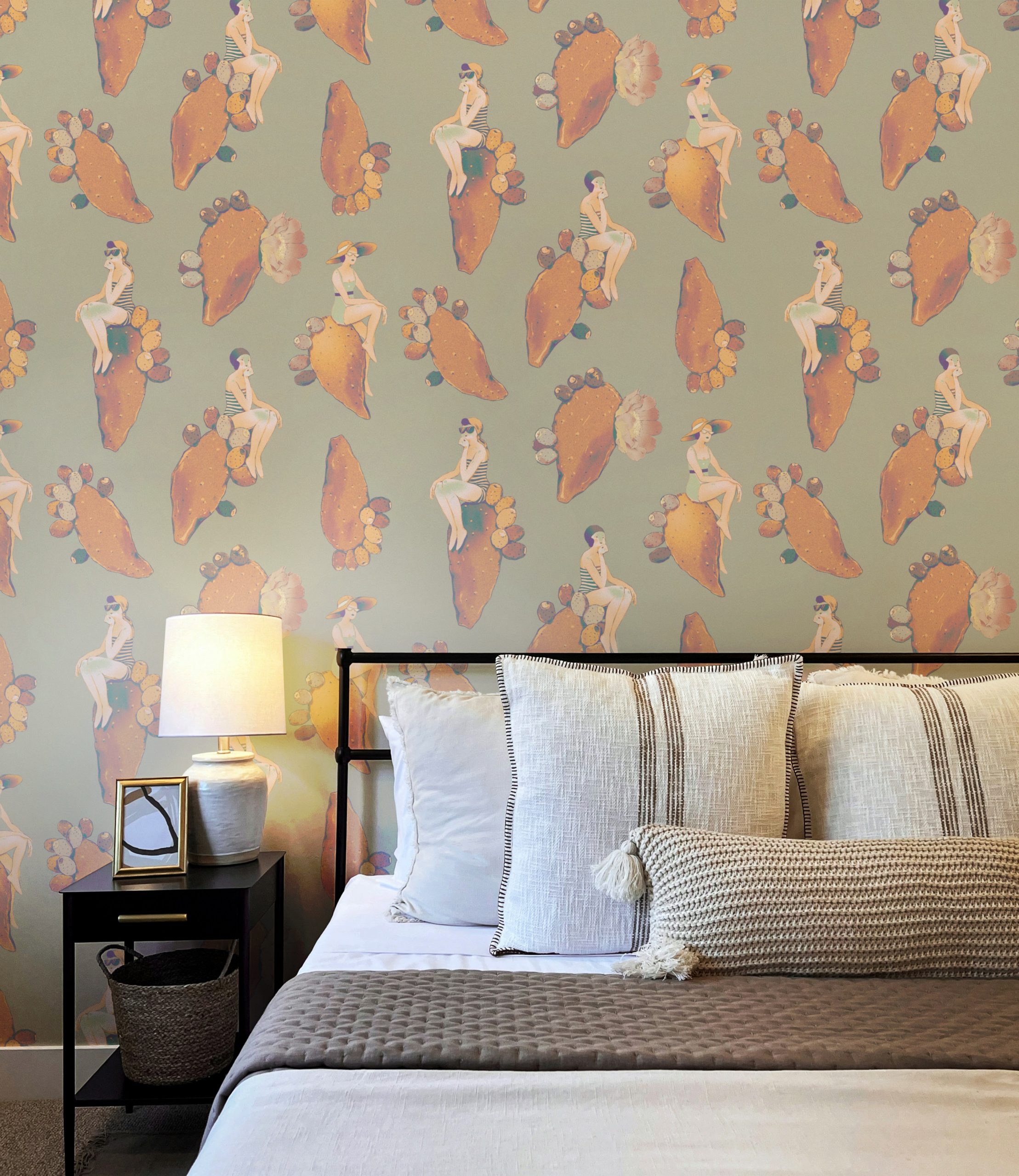 Questo design dalle sfumature delicate vi riporterà al mare del sud, con fanciulle vestite à la mode appoggiate su pale di fichi d’india fluttuanti.