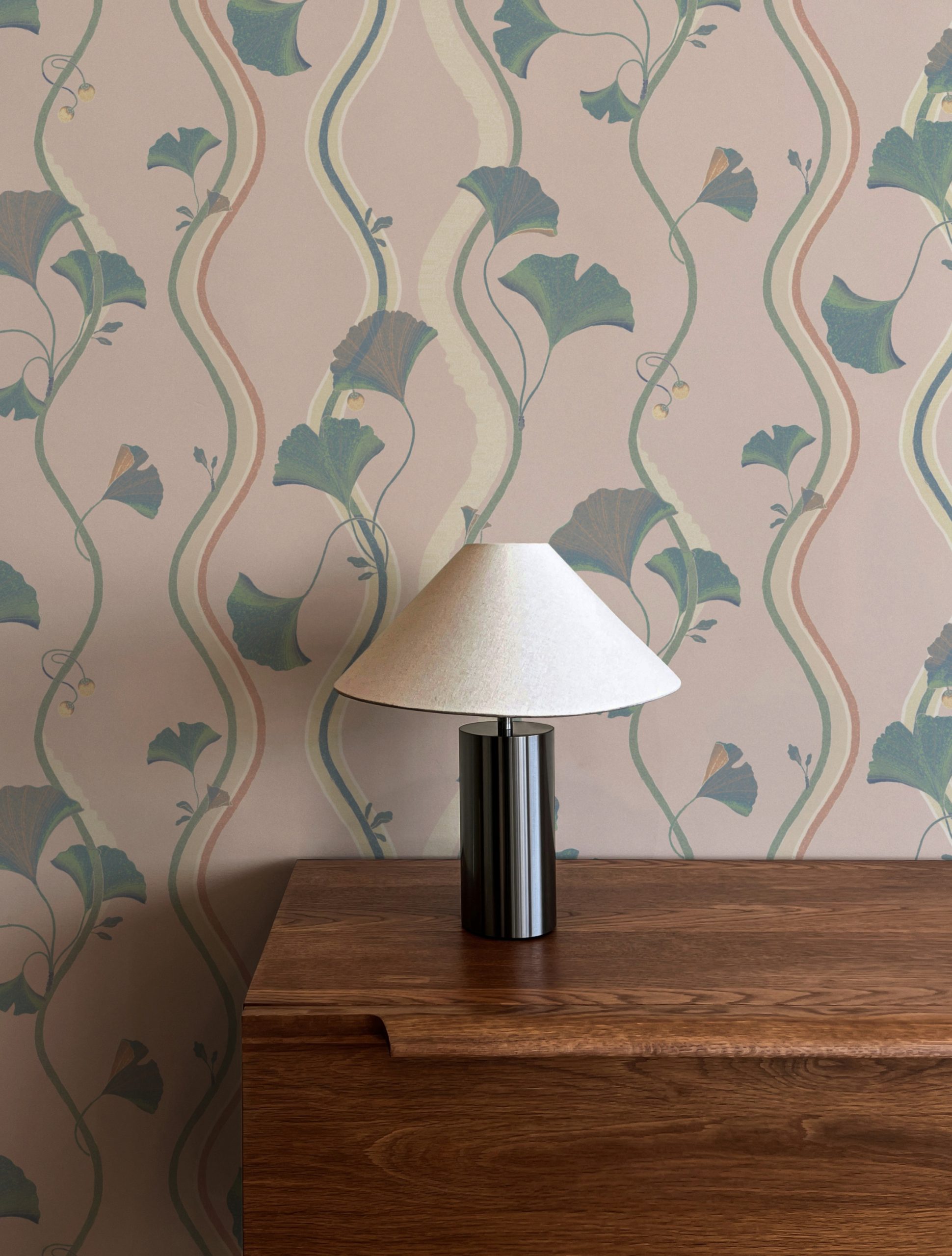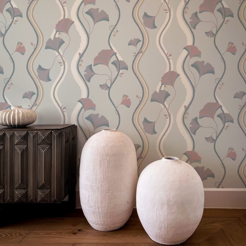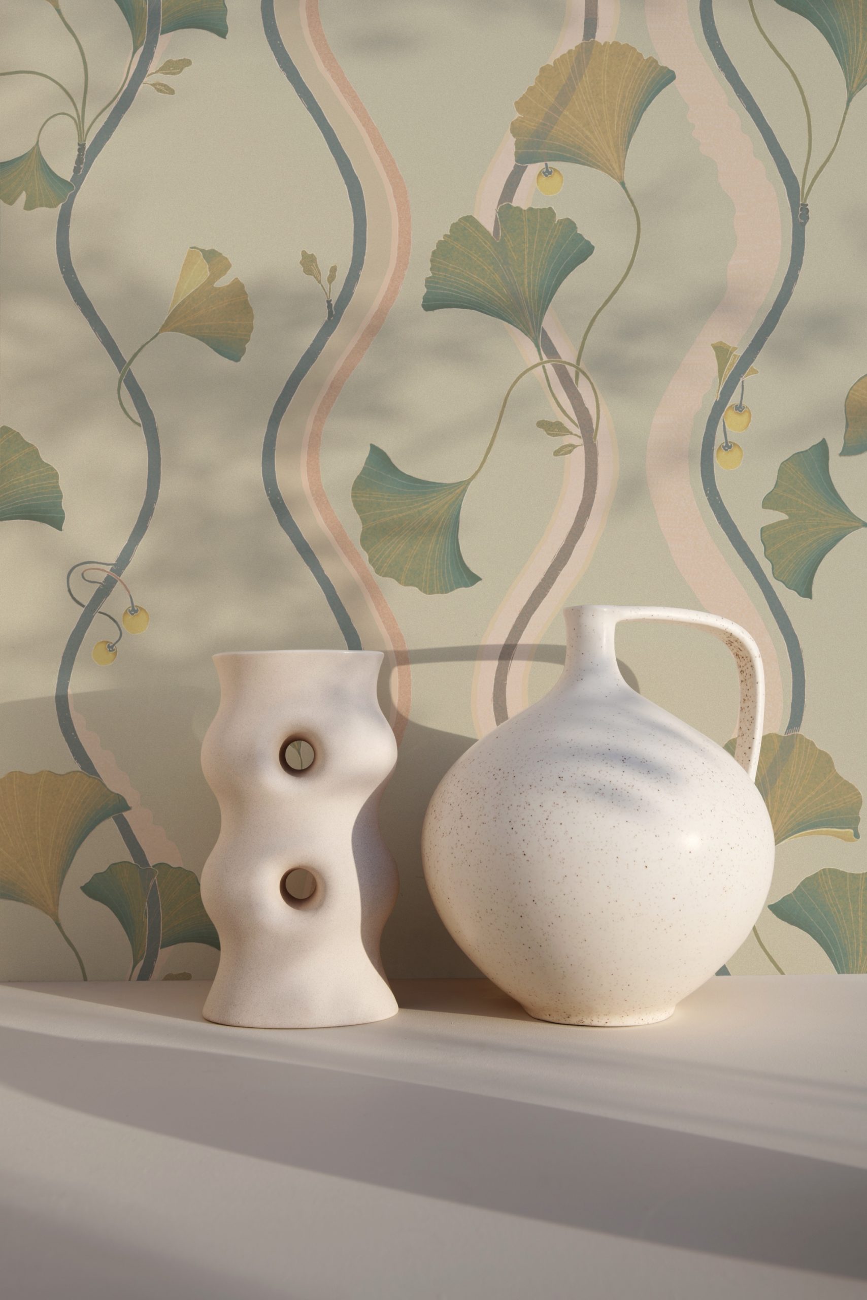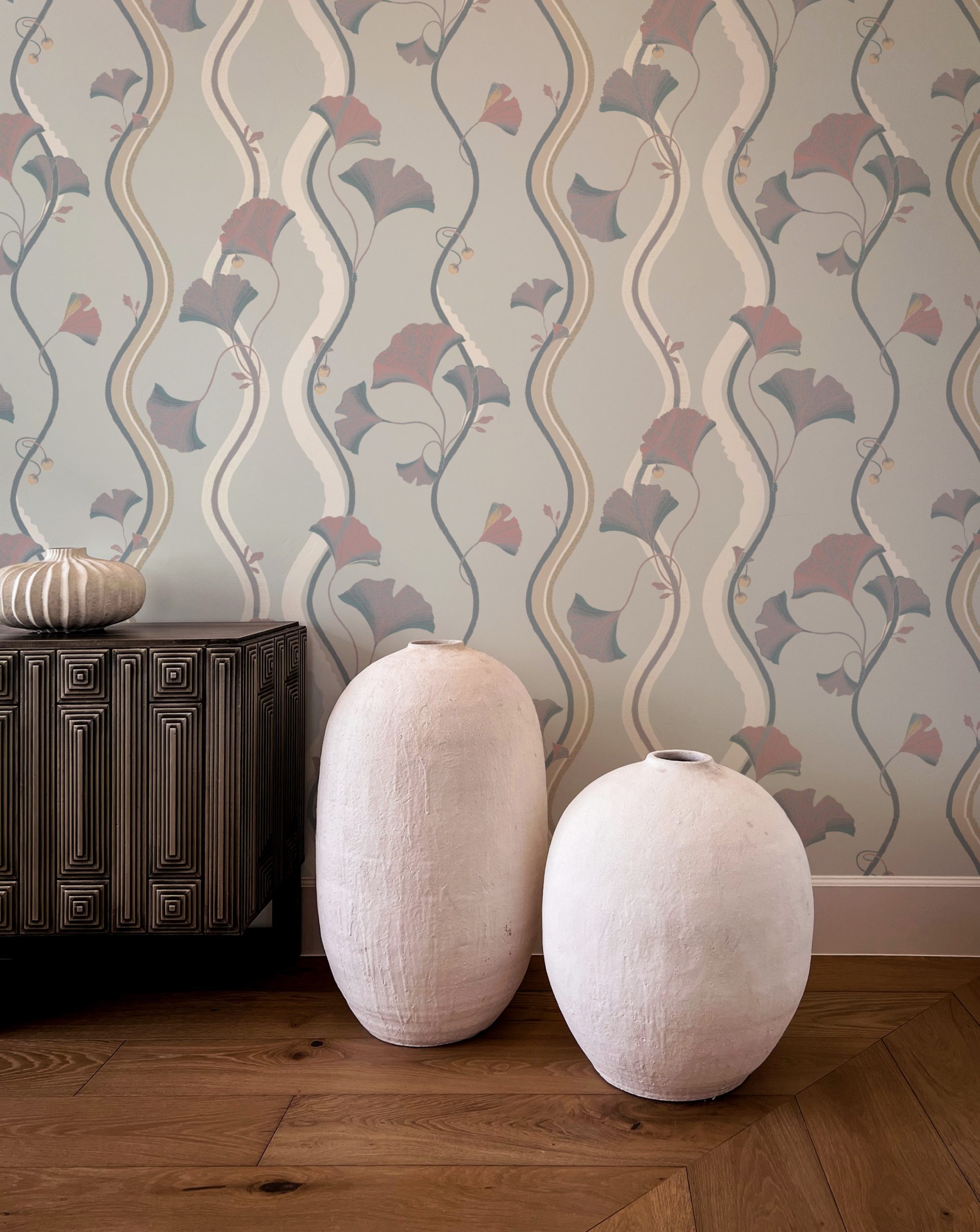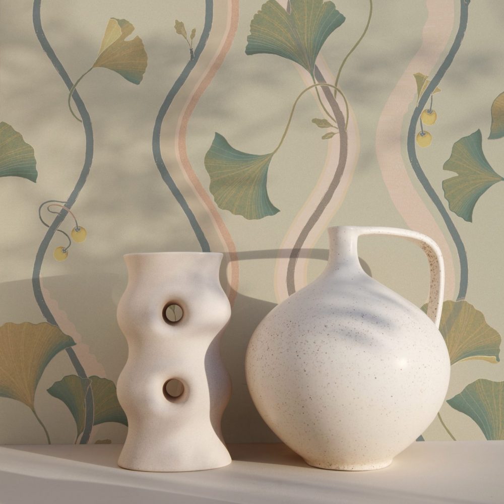 U pattern elegante e naturale, dove sottili rami di ginkgo si snodano in linee ondulate verticali, creando una danza leggera e ritmica. I rami, sottili e flessuosi, sembrano muoversi come sospinti da una brezza gentile e foglie di ginkgo si alternano lungo i rami con una disposizione asimmetrica e naturale.