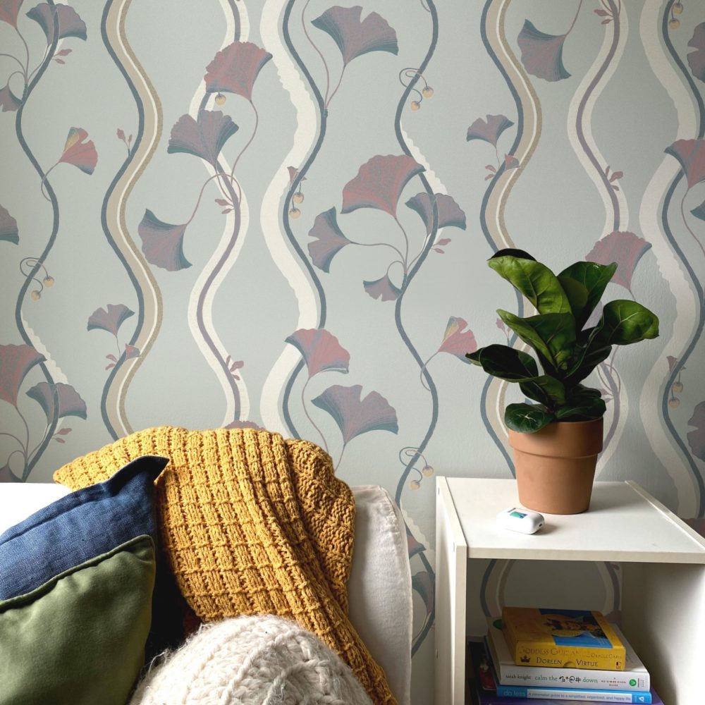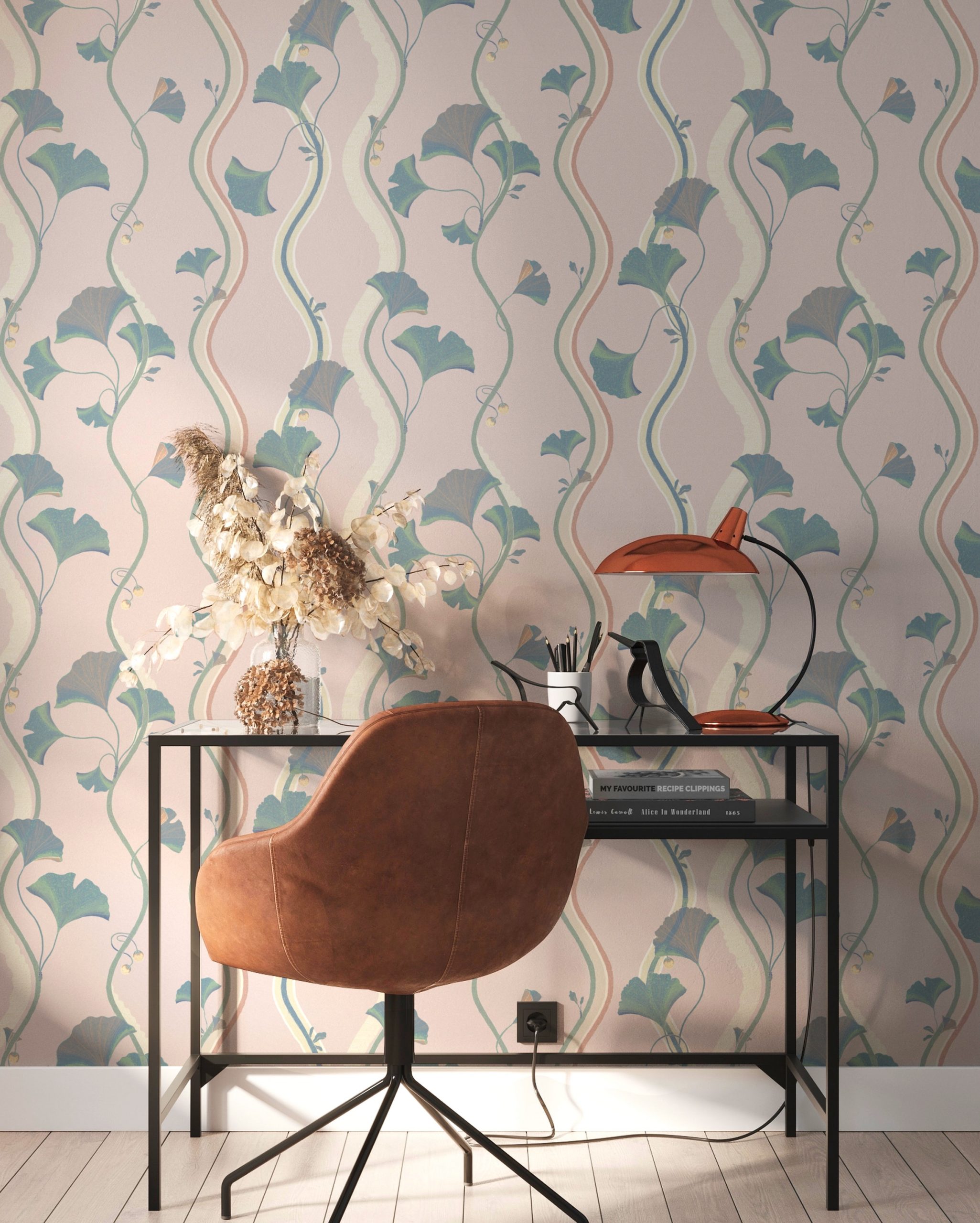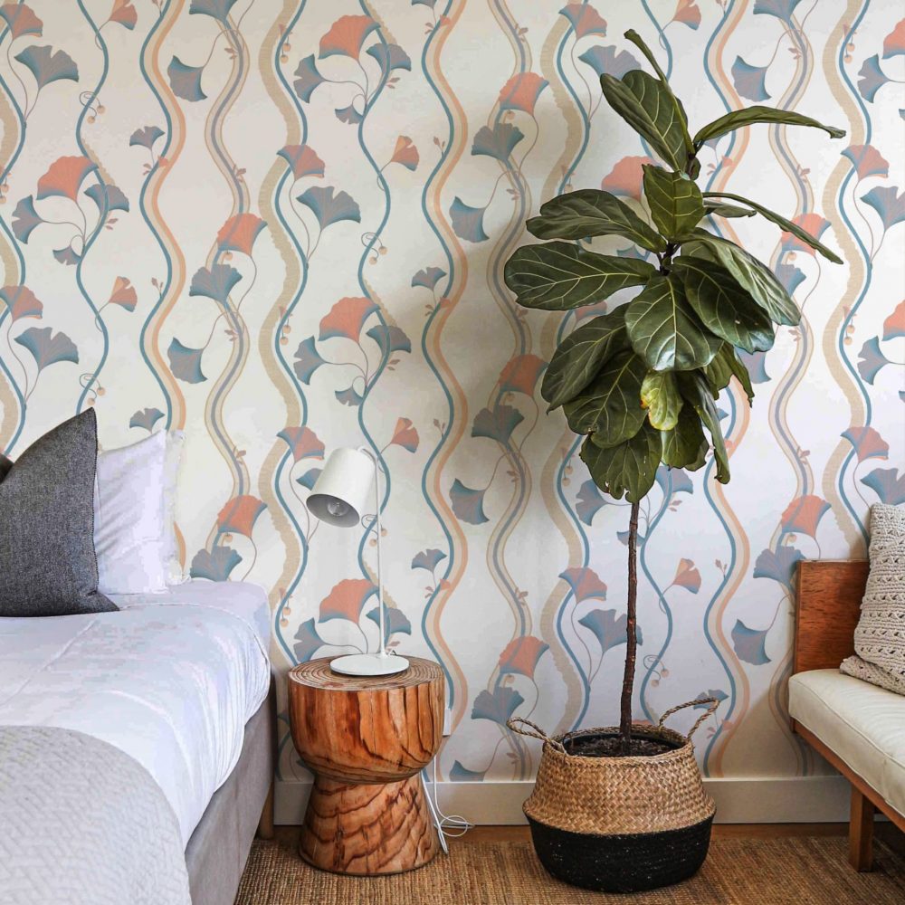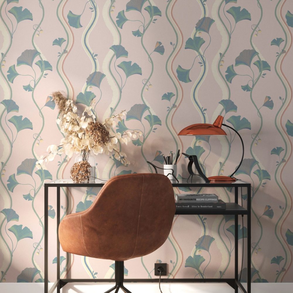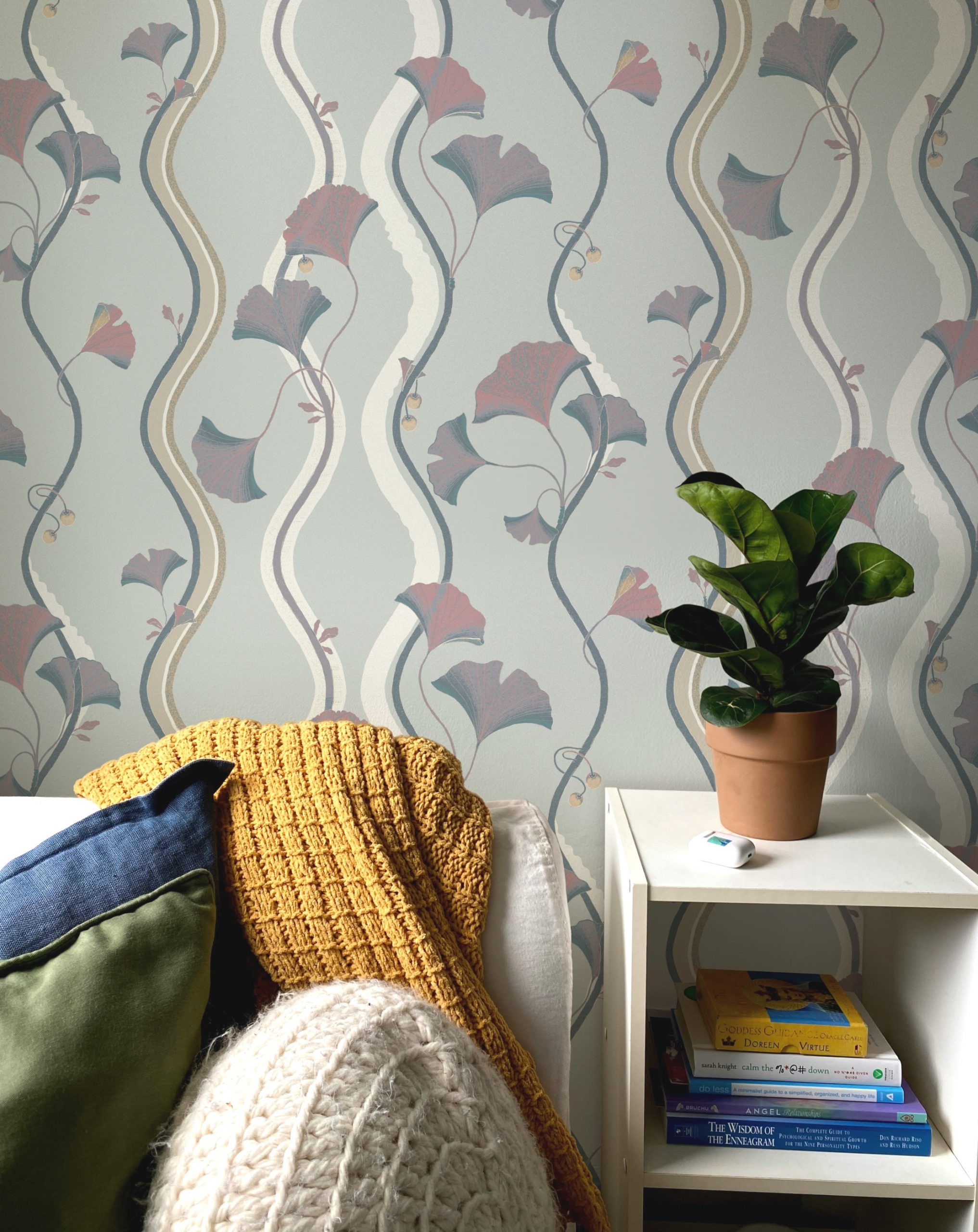 U pattern elegante e naturale, dove sottili rami di ginkgo si snodano in linee ondulate verticali, creando una danza leggera e ritmica. I rami, sottili e flessuosi, sembrano muoversi come sospinti da una brezza gentile e foglie di ginkgo si alternano lungo i rami con una disposizione asimmetrica e naturale.
