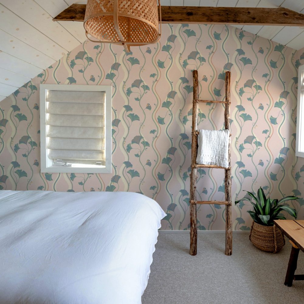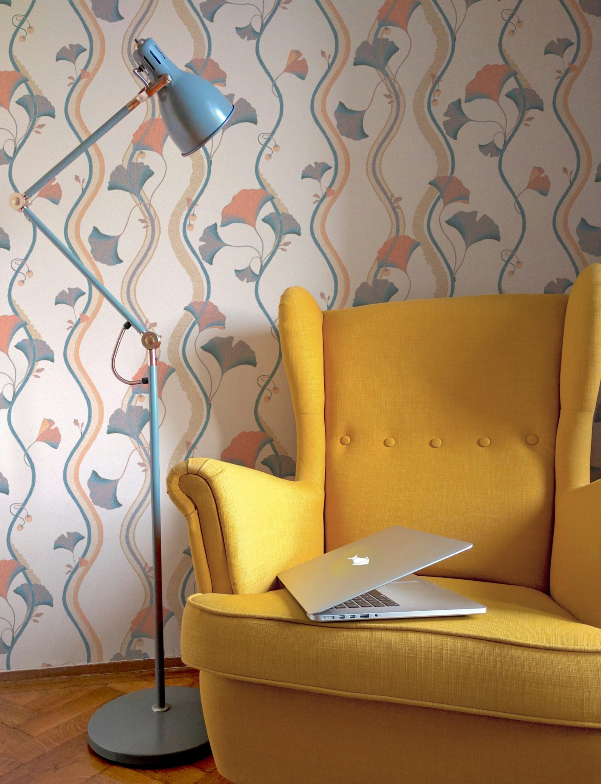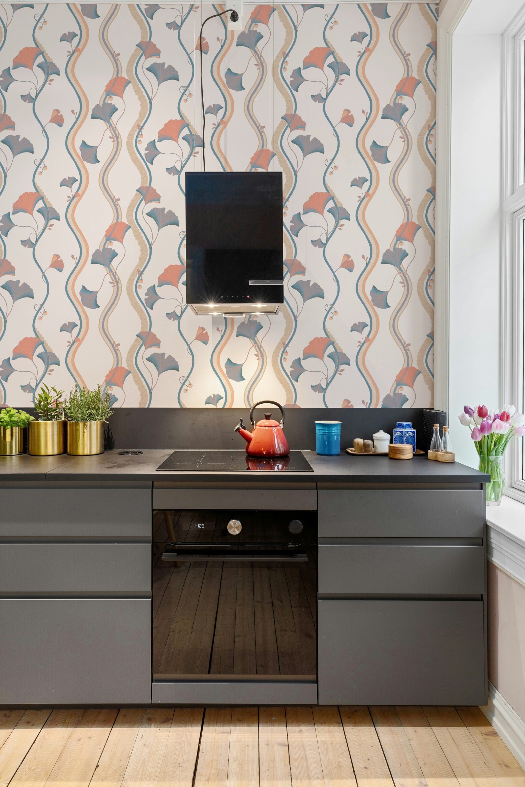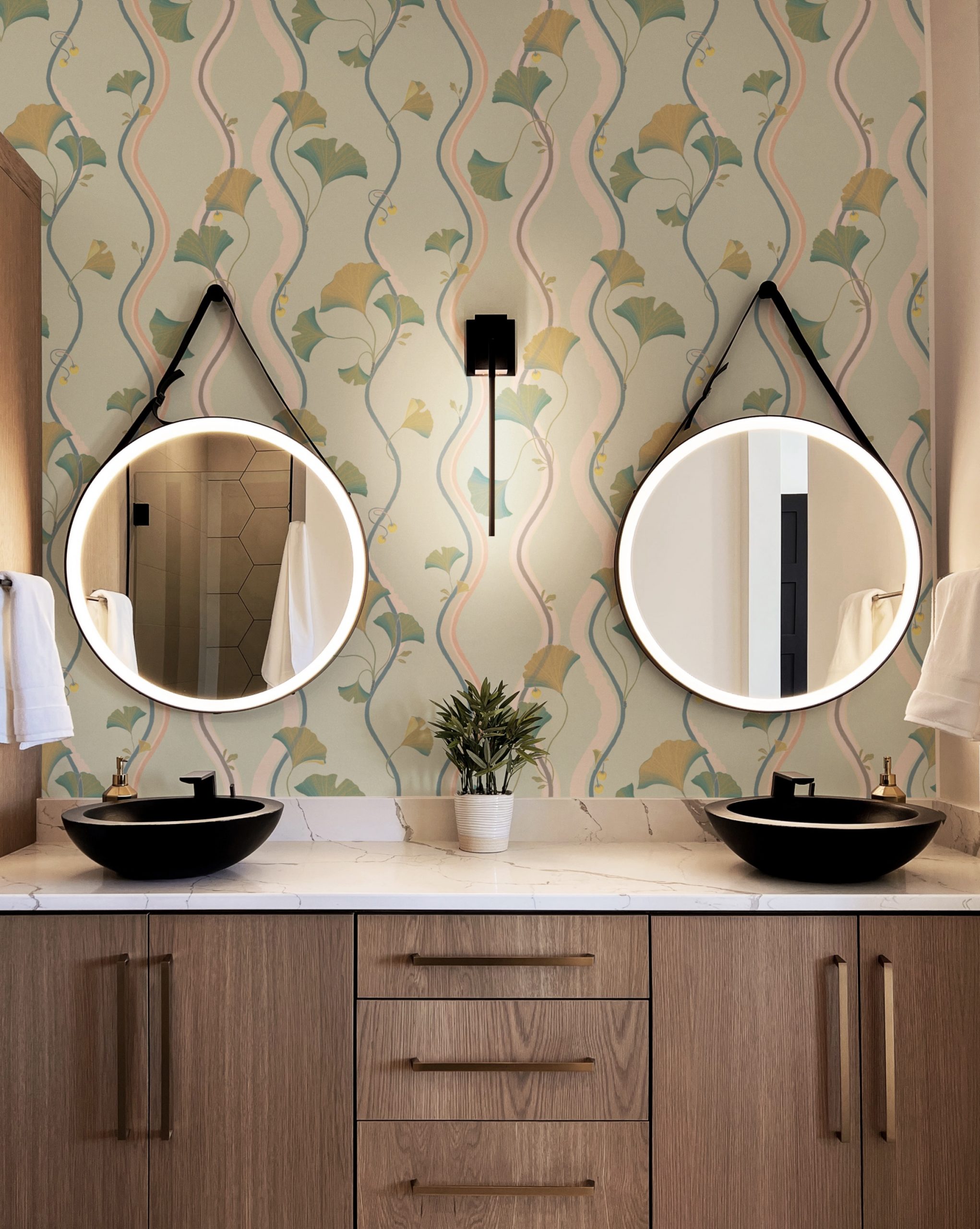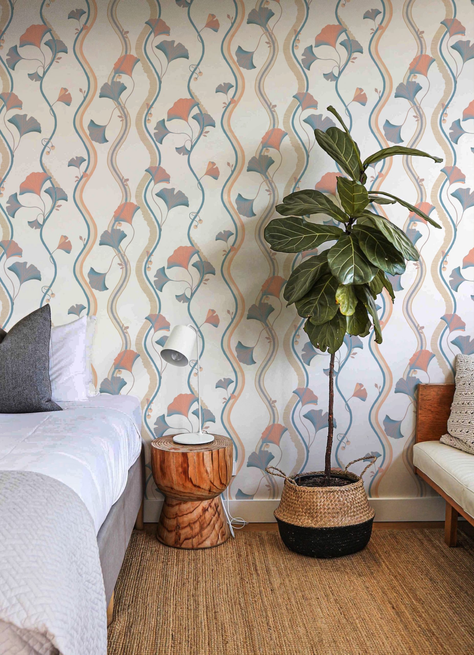 U pattern elegante e naturale, dove sottili rami di ginkgo si snodano in linee ondulate verticali, creando una danza leggera e ritmica. I rami, sottili e flessuosi, sembrano muoversi come sospinti da una brezza gentile e foglie di ginkgo si alternano lungo i rami con una disposizione asimmetrica e naturale.