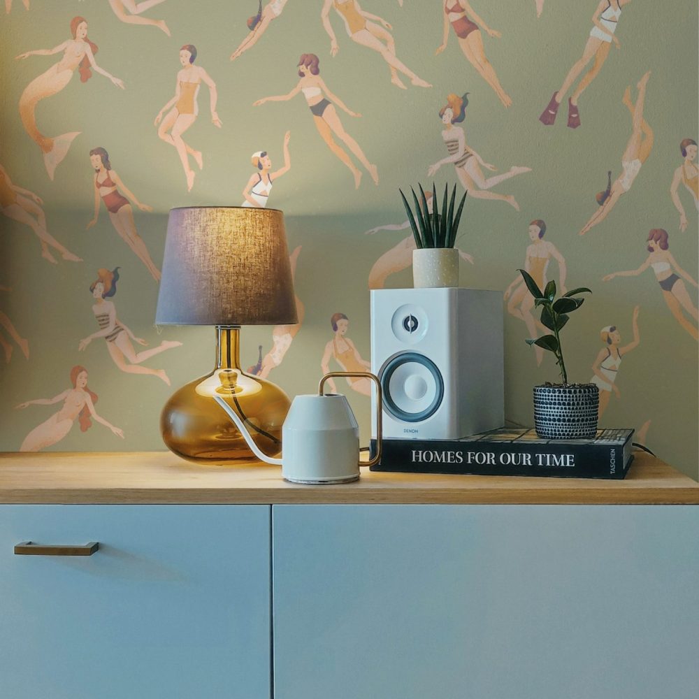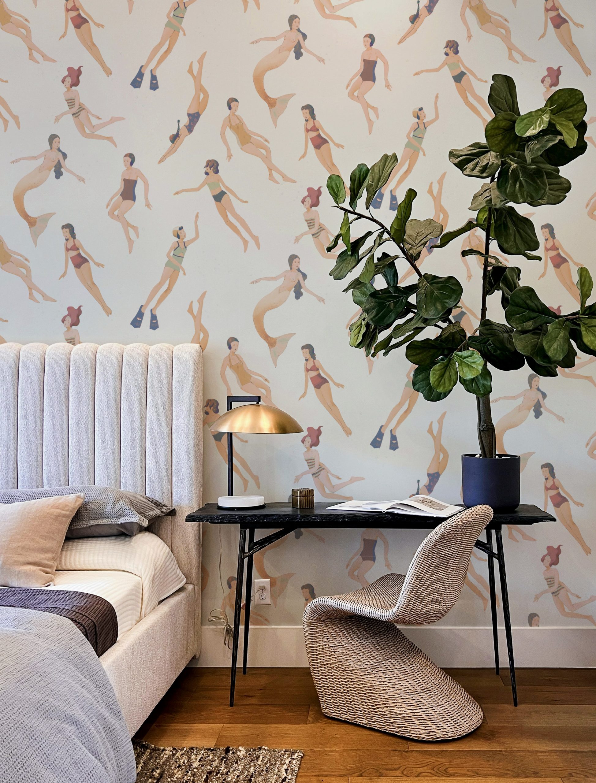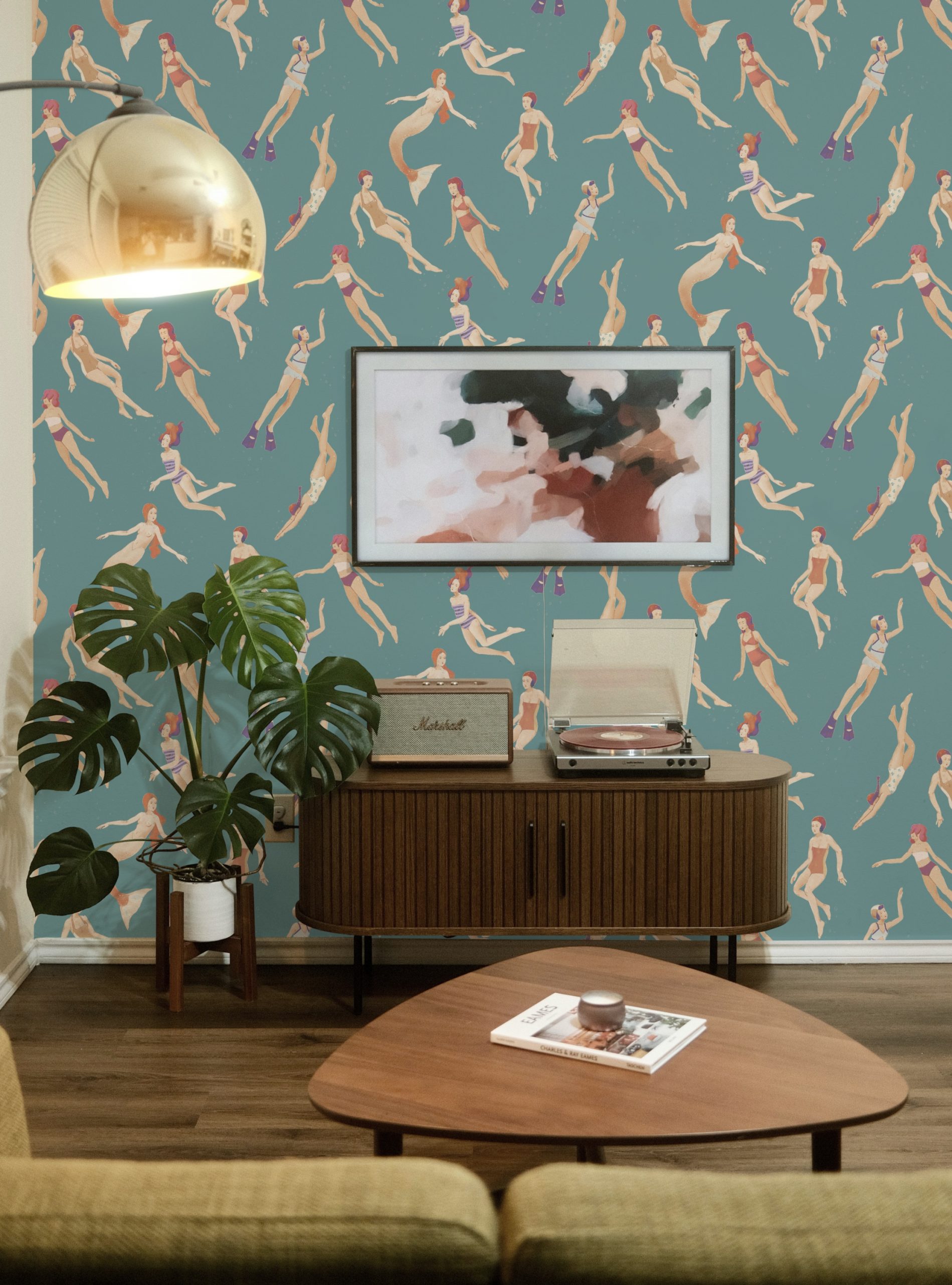Rappresentazione di bagnanti con costumi e cuffiette in stile vintage.