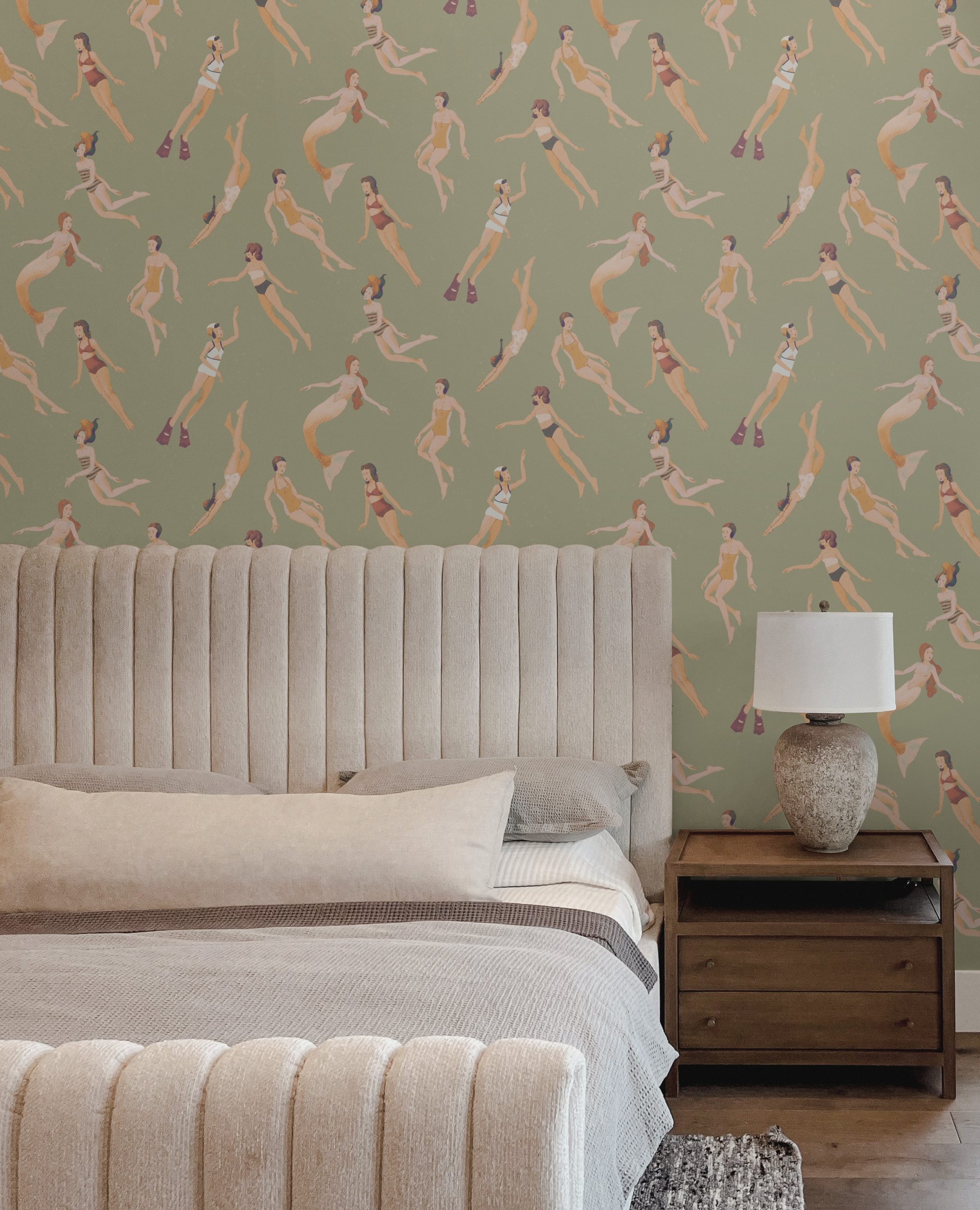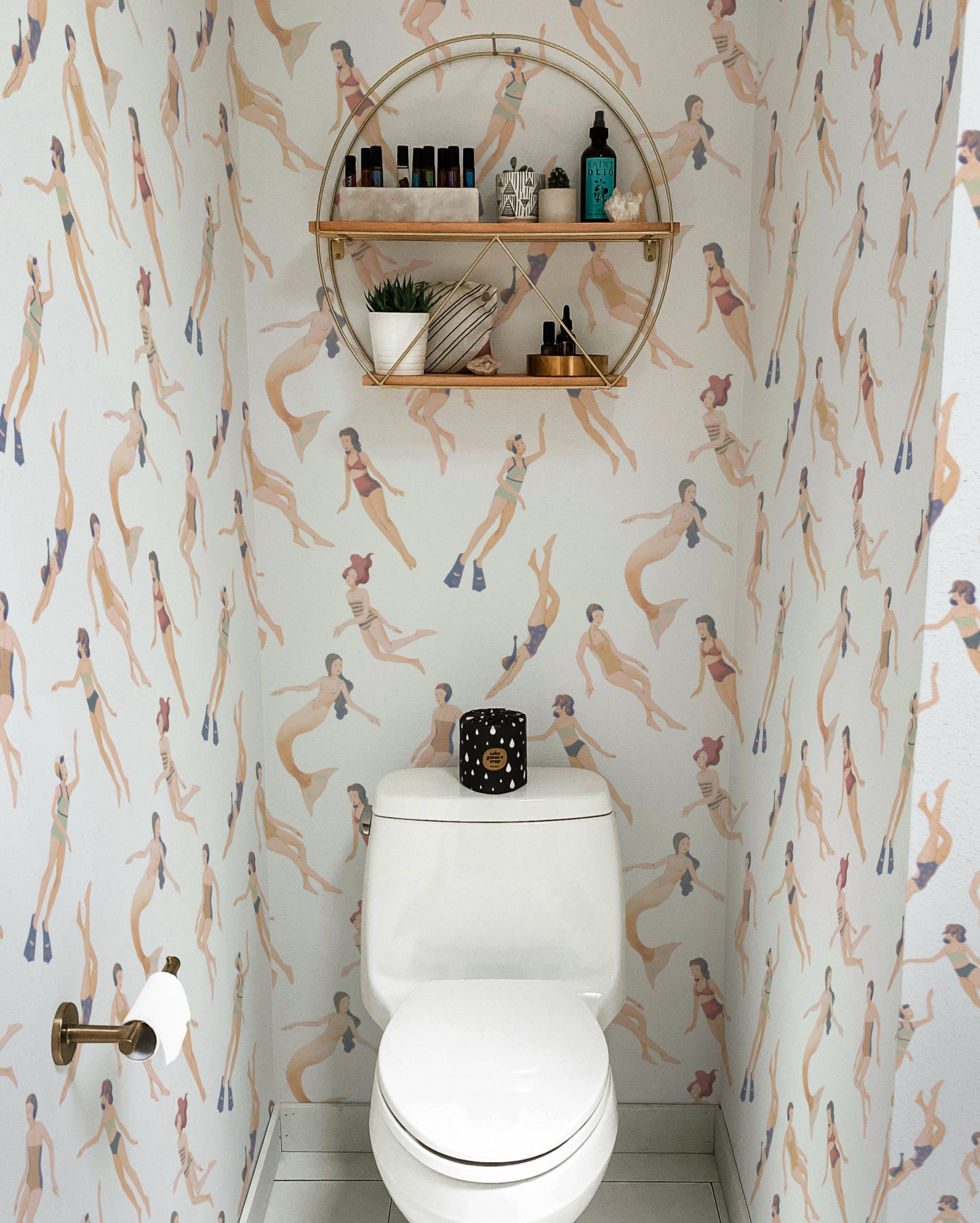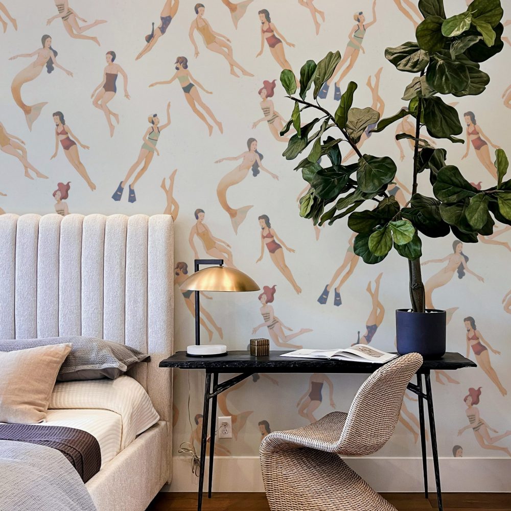 Rappresentazione di bagnanti con costumi e cuffiette in stile vintage.