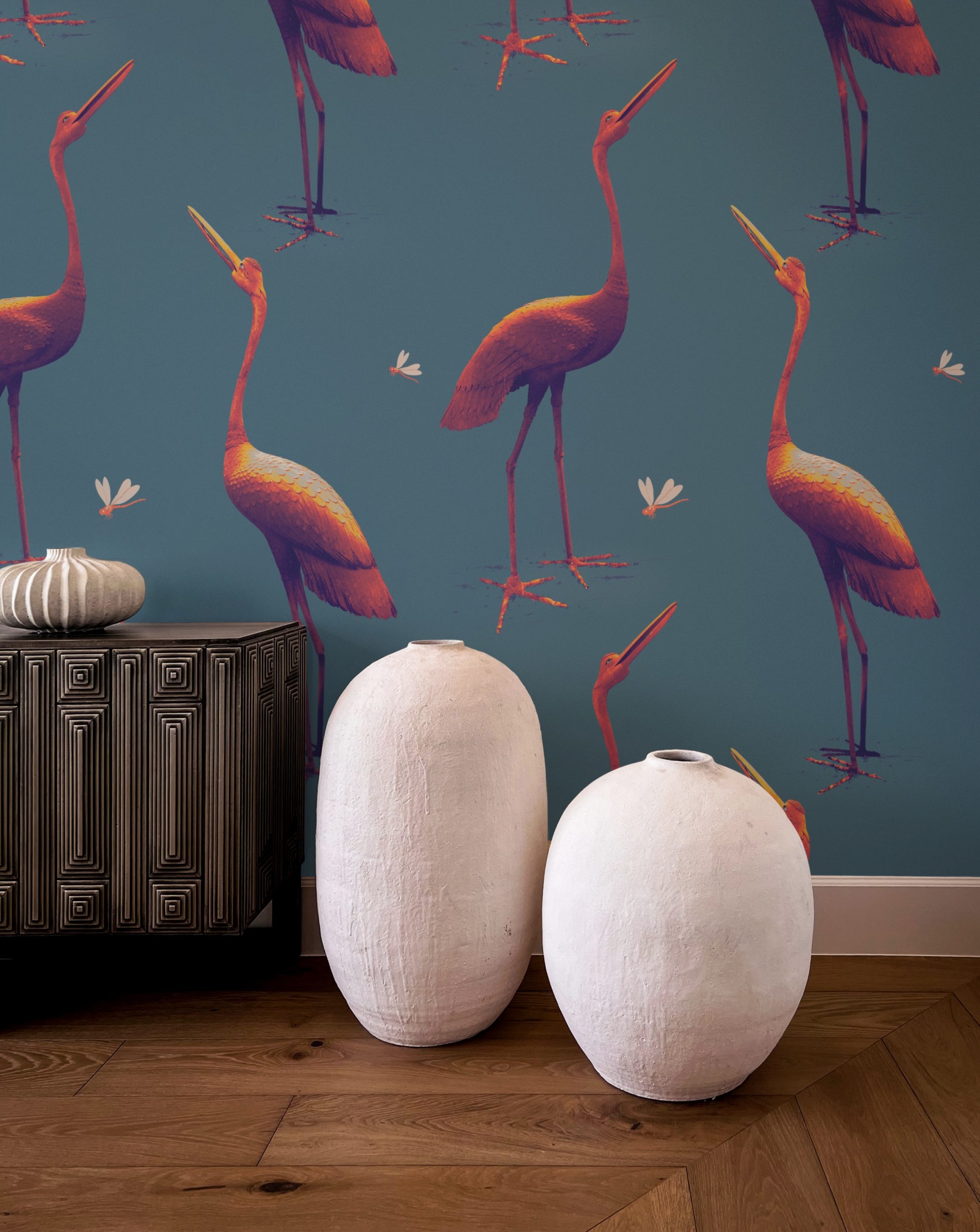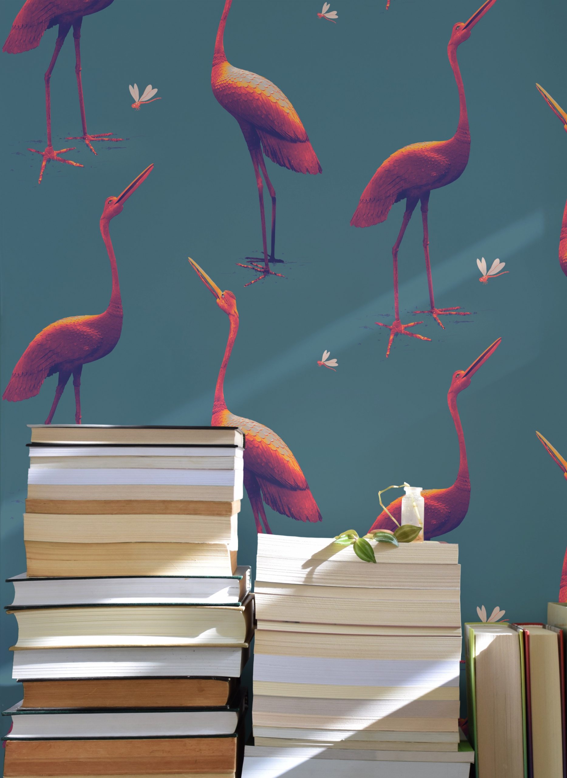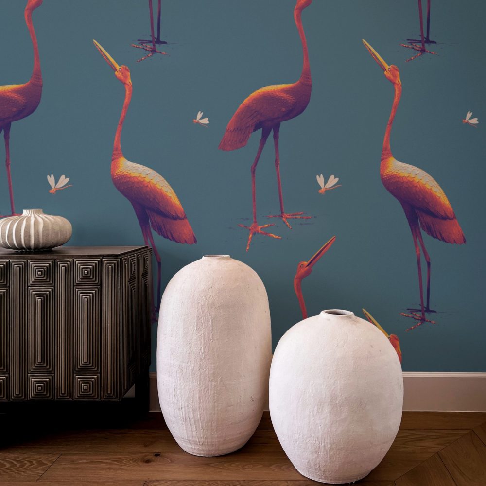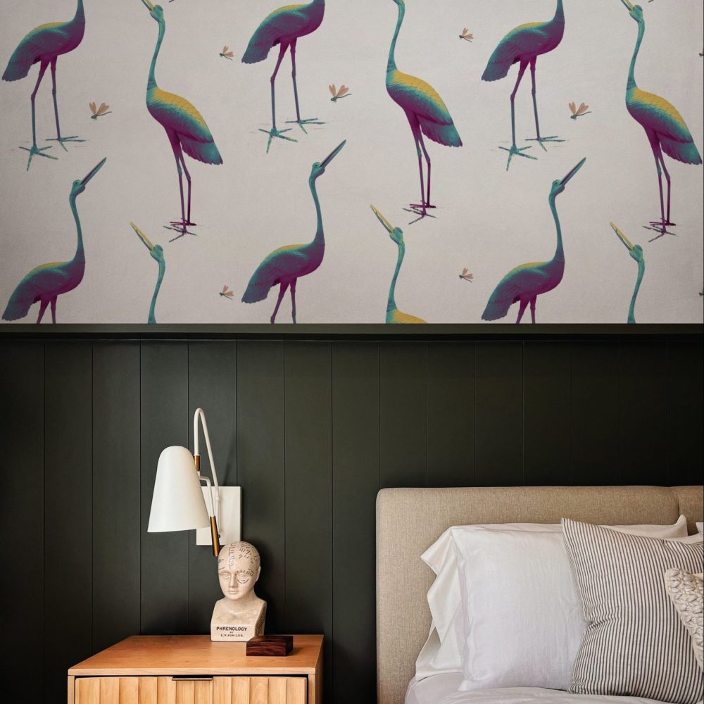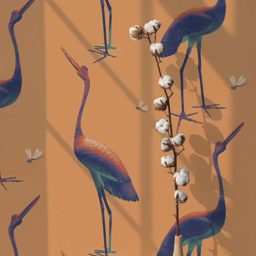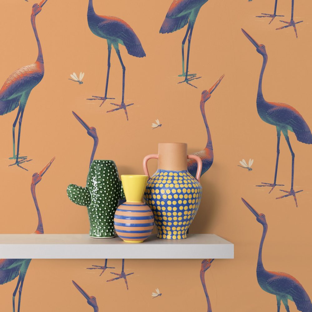Questa carta da parati si ispira a due maestose statue in bronzo scolpite nel 1800. Le piccole libellule portano un tocco giocoso e leggero.