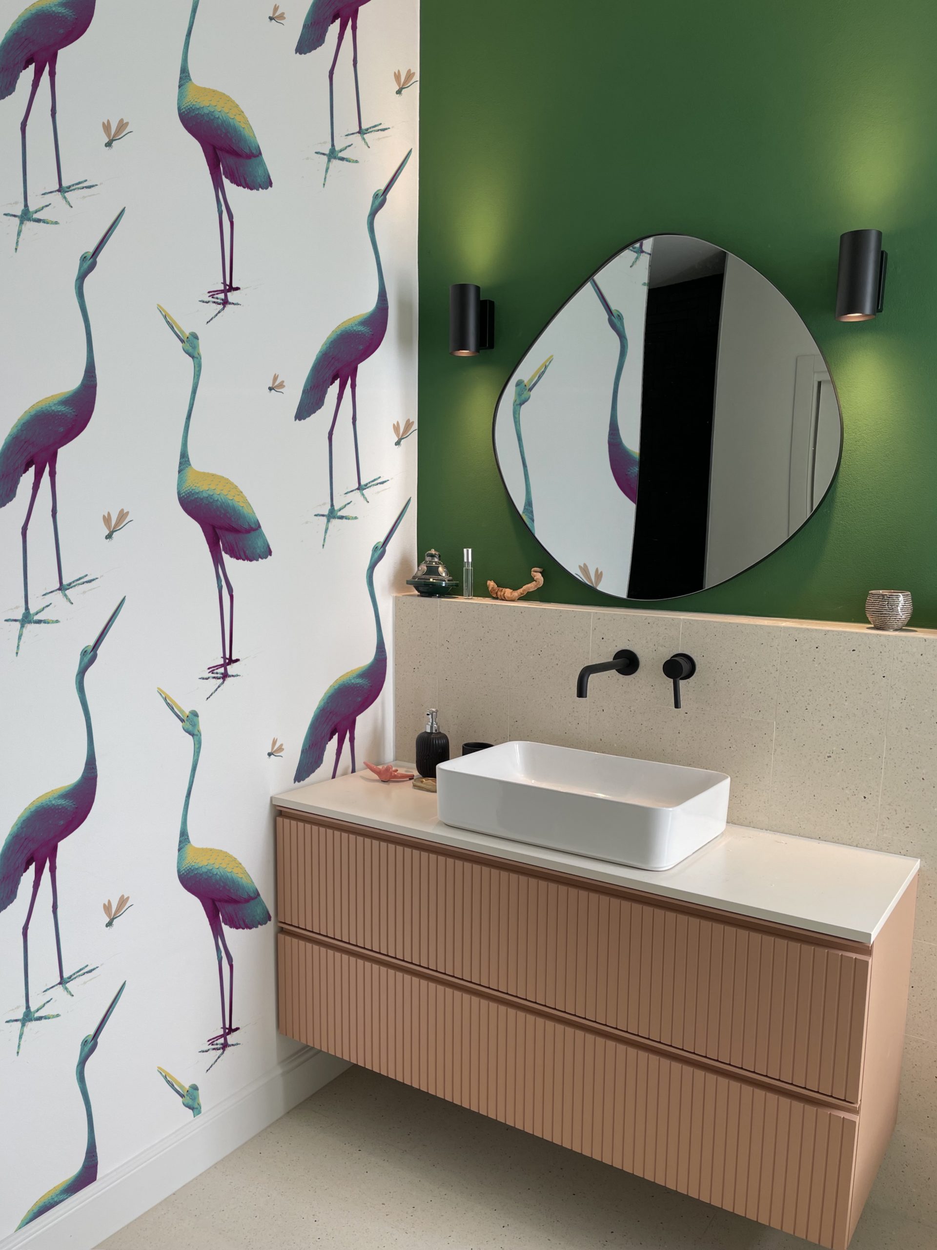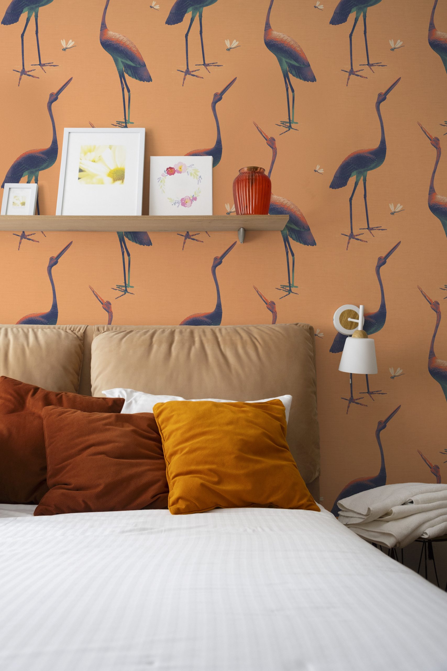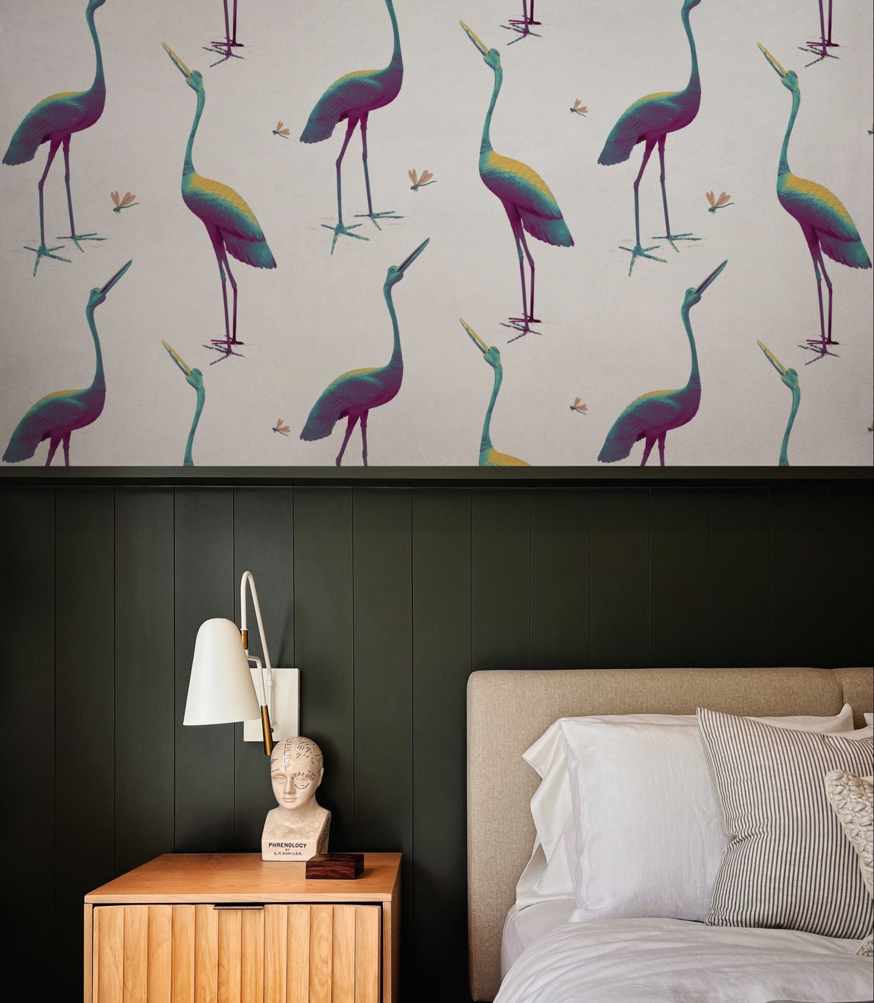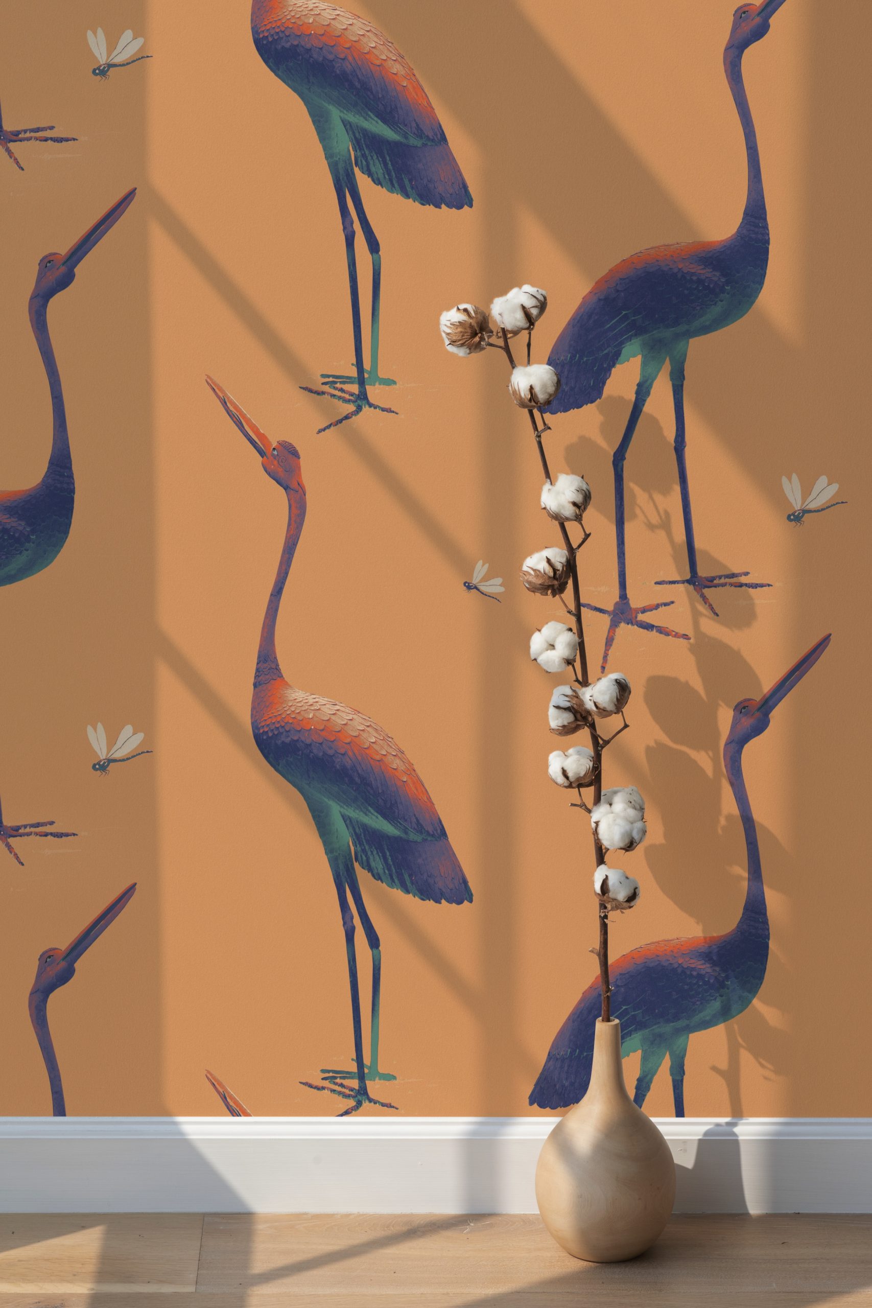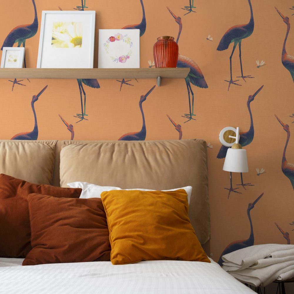 Questa carta da parati si ispira a due maestose statue in bronzo scolpite nel 1800. Le piccole libellule portano un tocco giocoso e leggero.