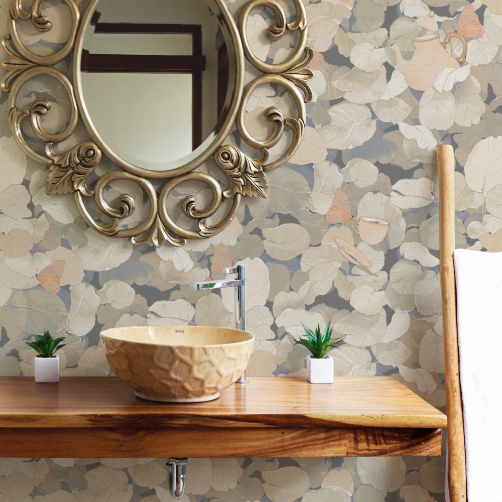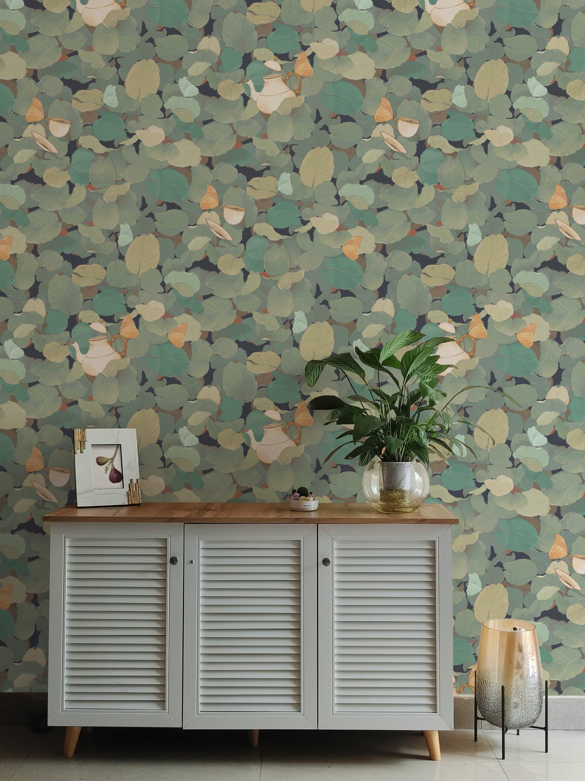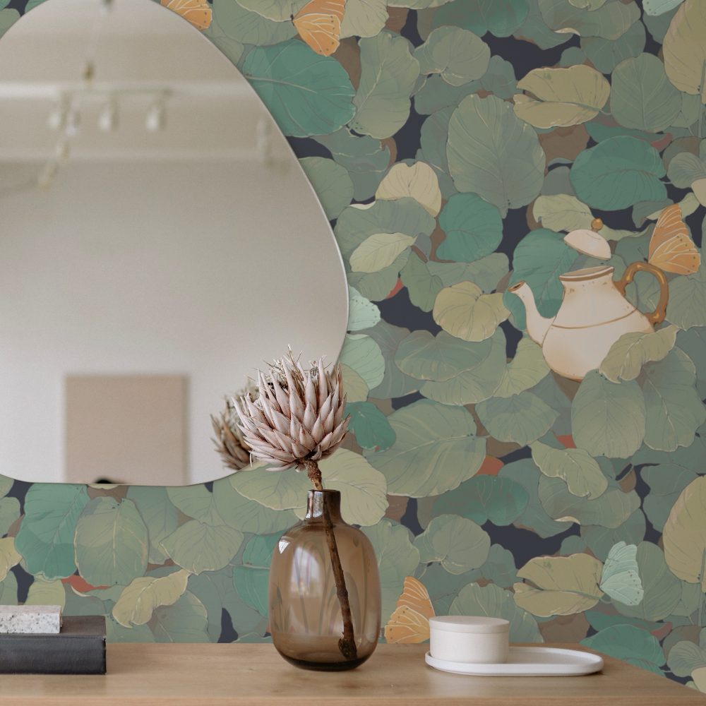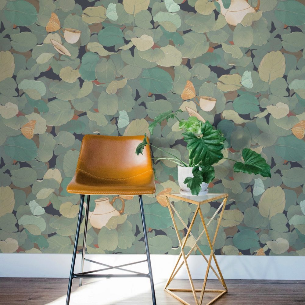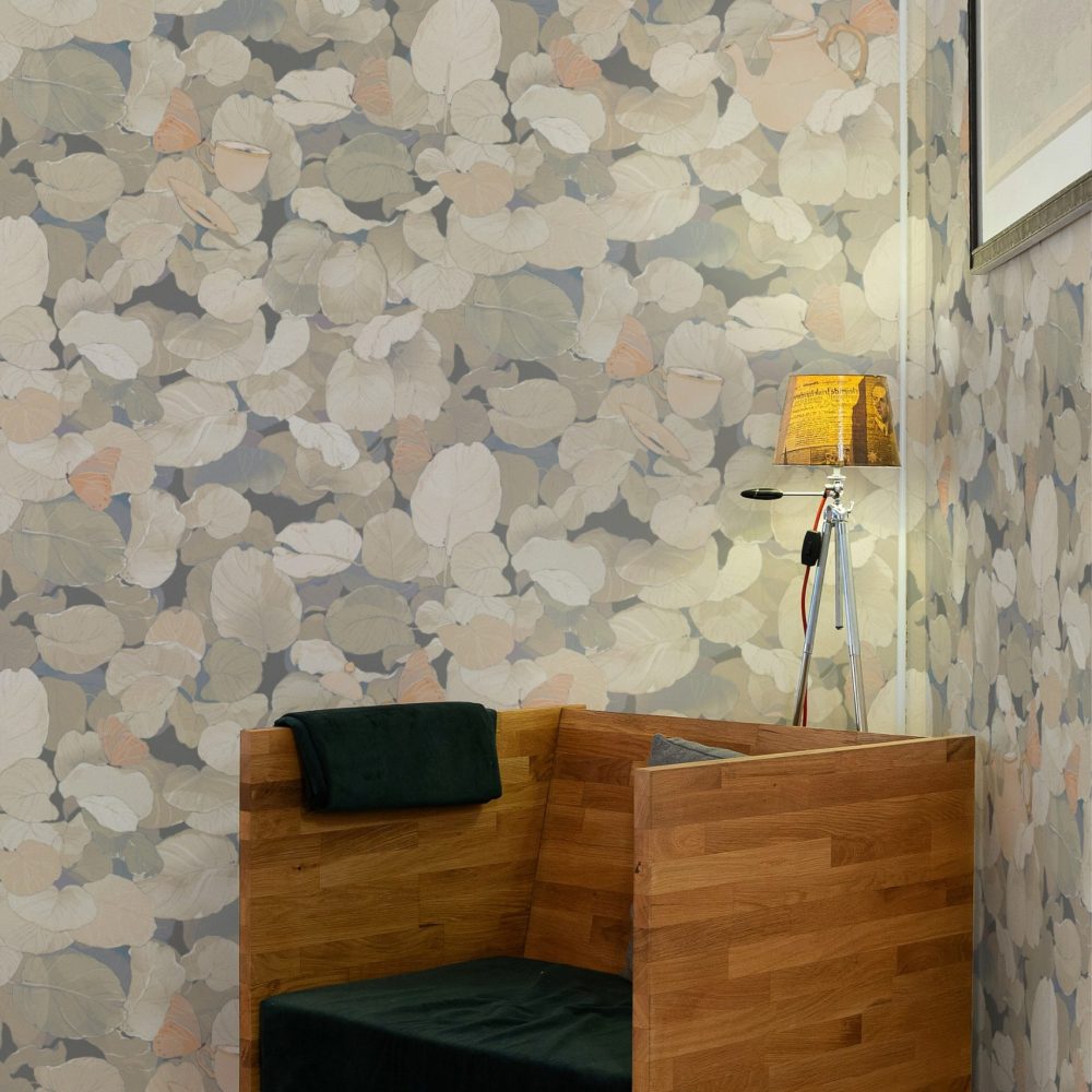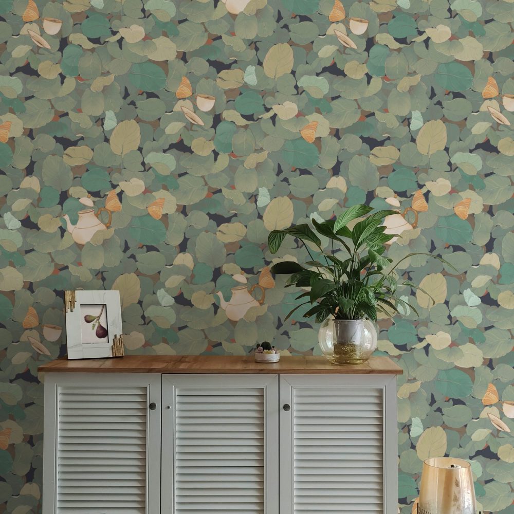 In questo fitto fogliame emergono fluttuanti teiere e tazze da tè sostenute da farfalle e vegetazione.