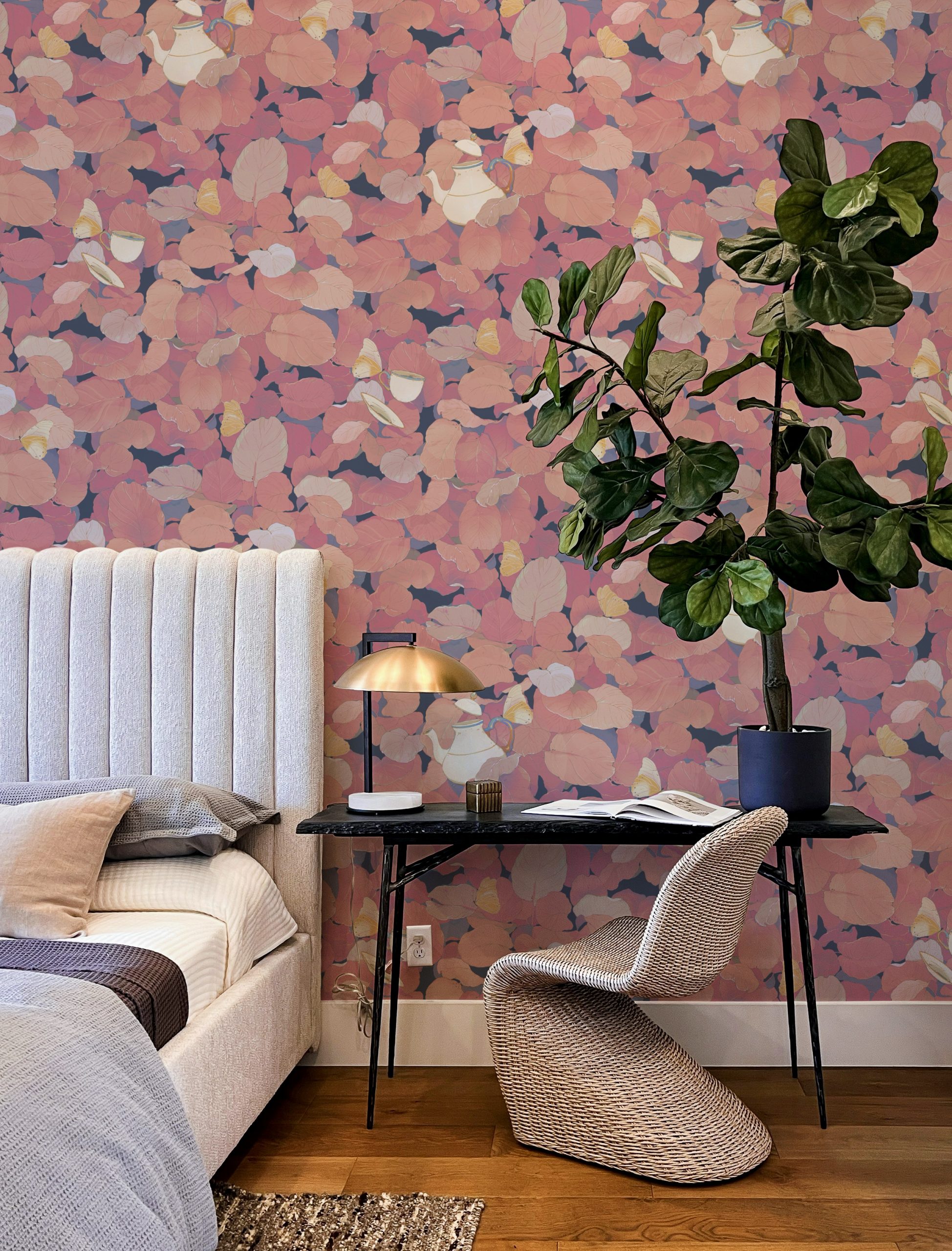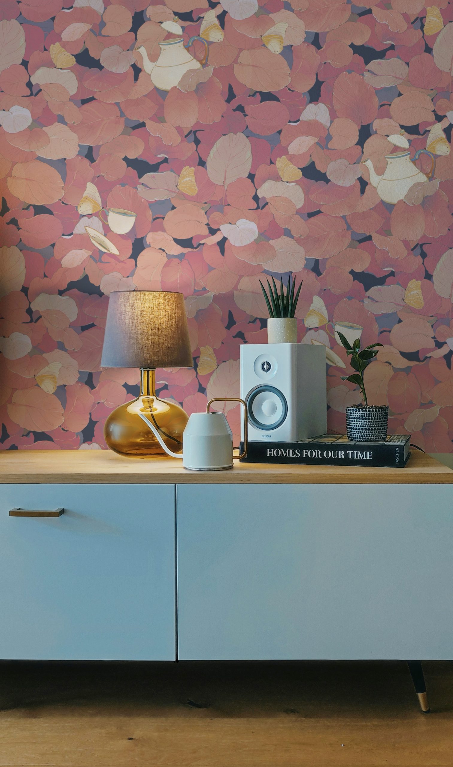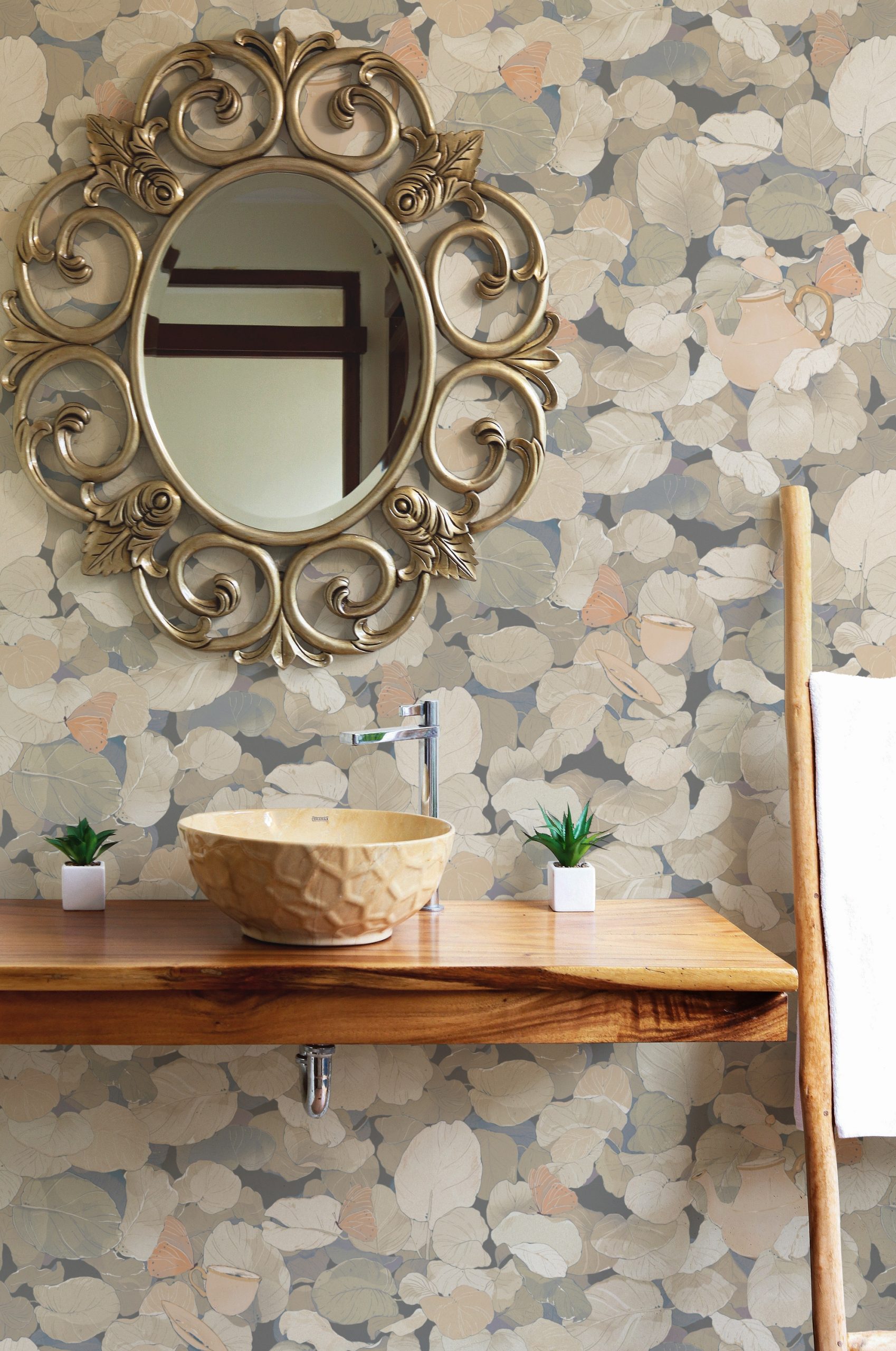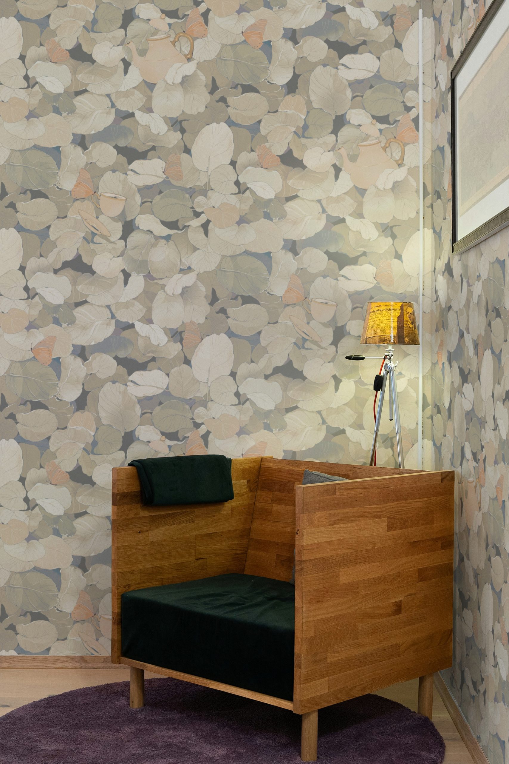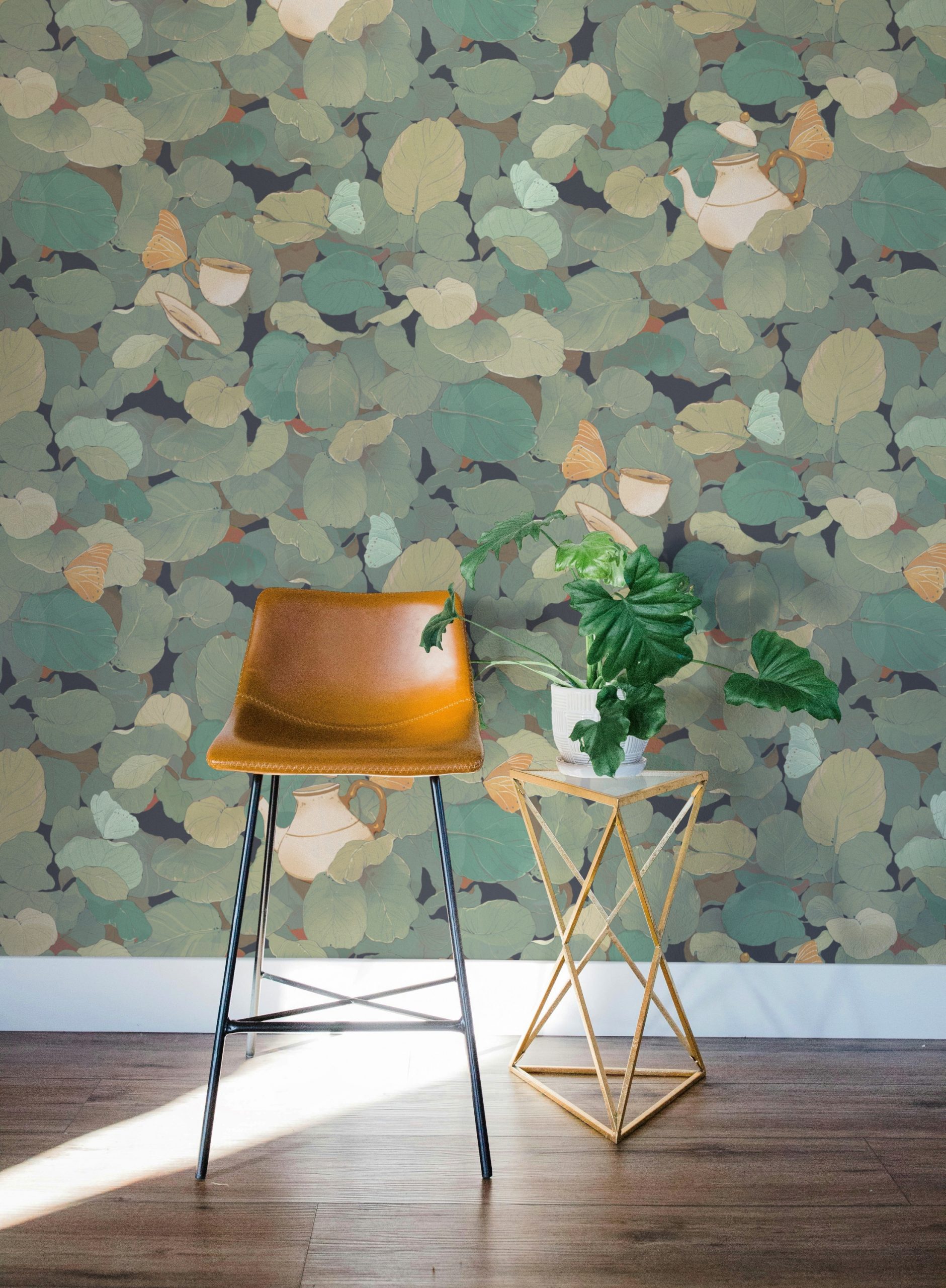 In questo fitto fogliame emergono fluttuanti teiere e tazze da tè sostenute da farfalle e vegetazione.