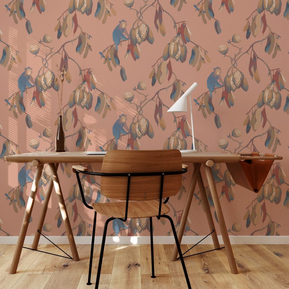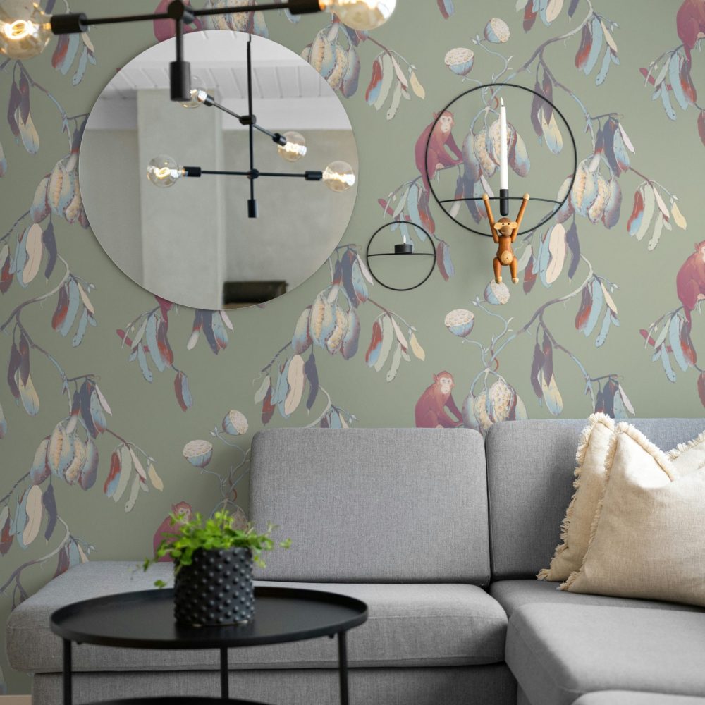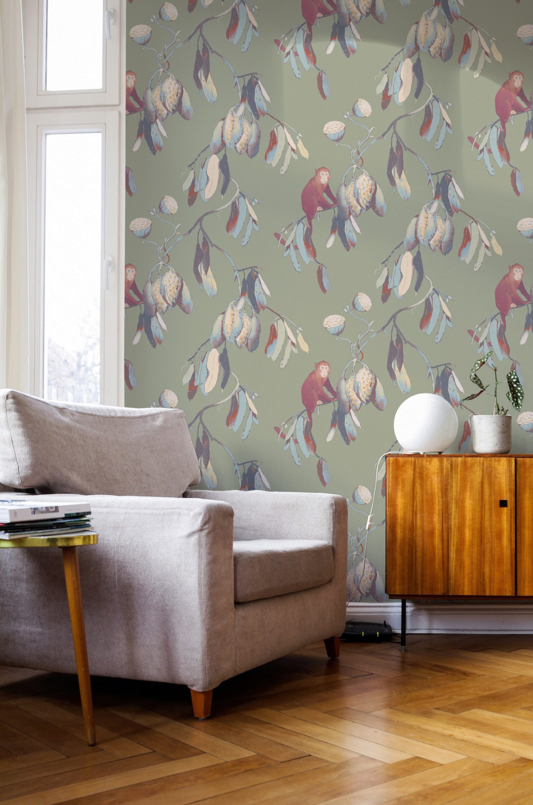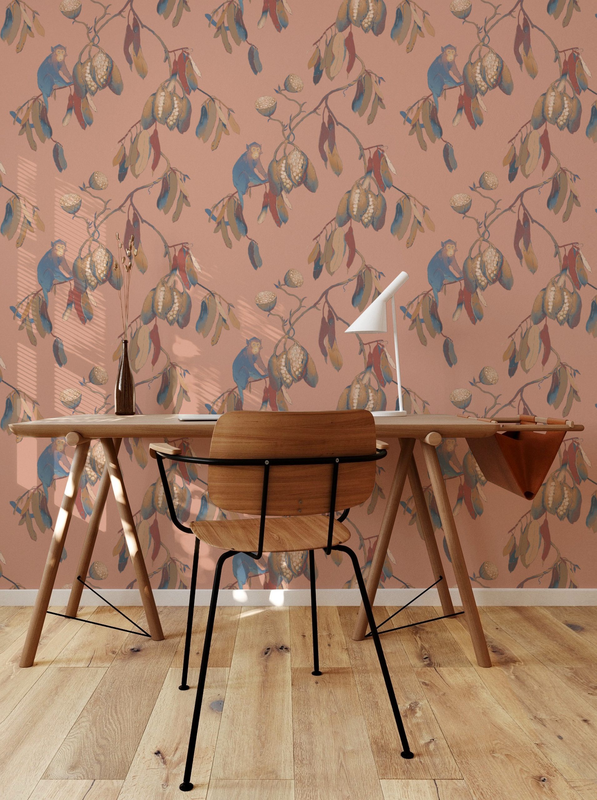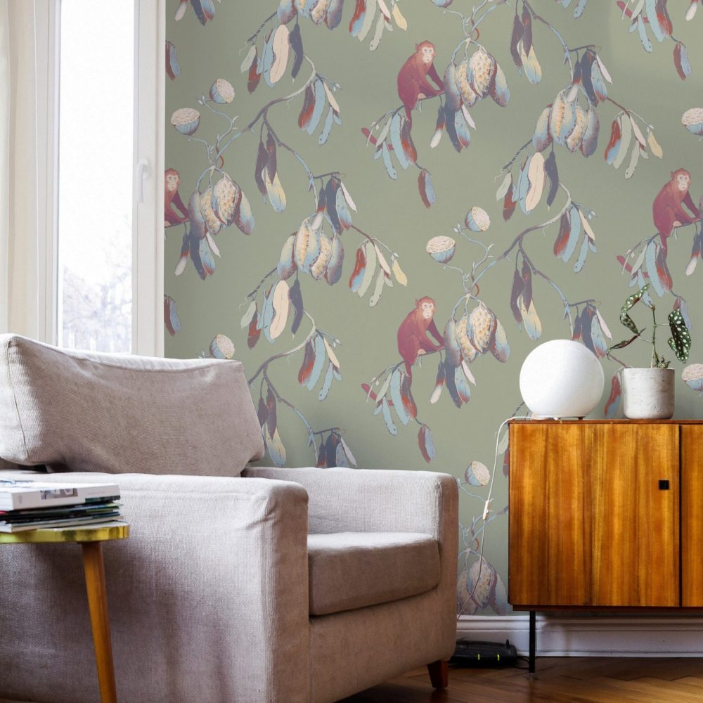 Una vegetazione delicata dai colori polverosi punteggiata da scimmie da toni pastello.