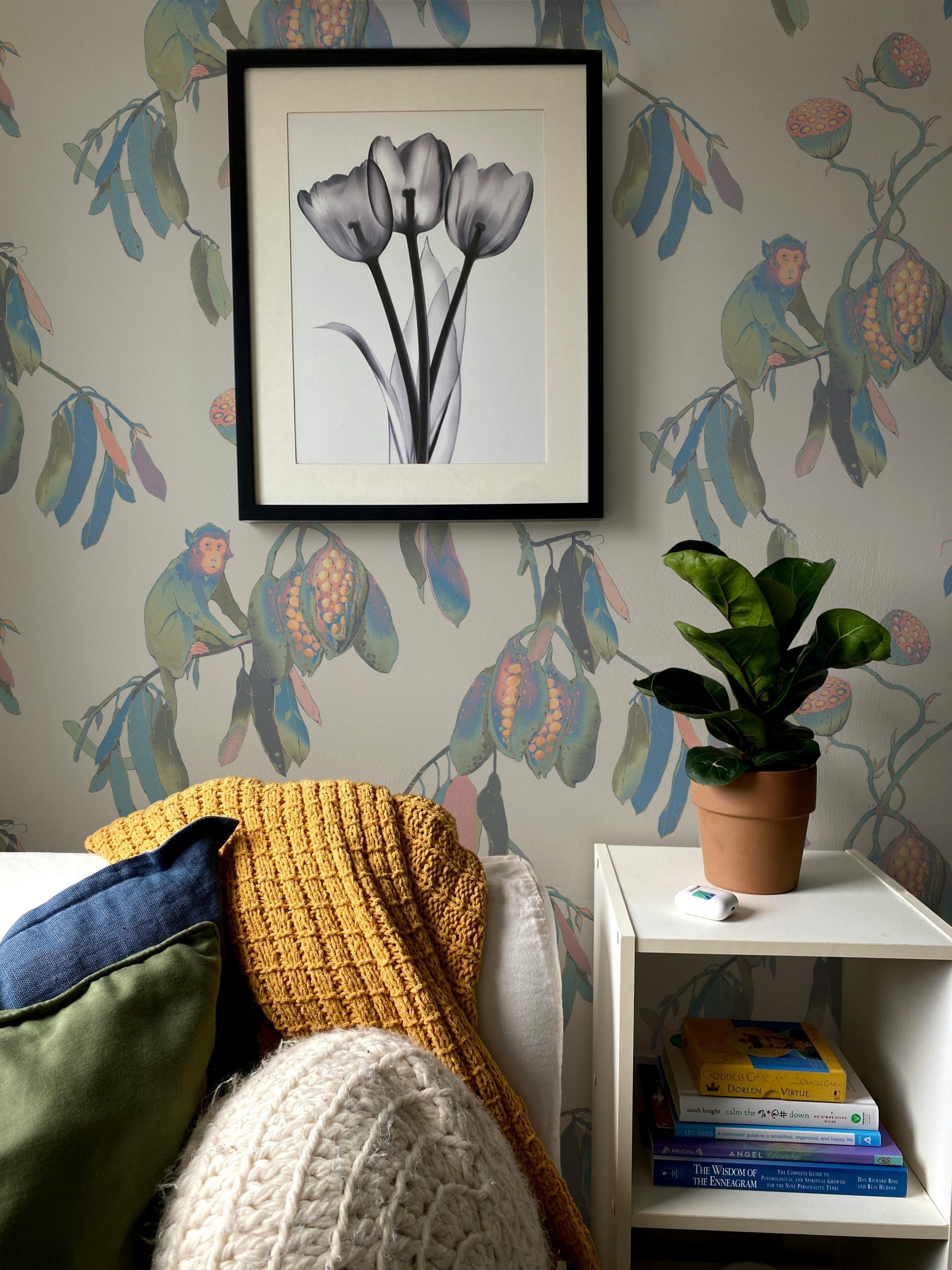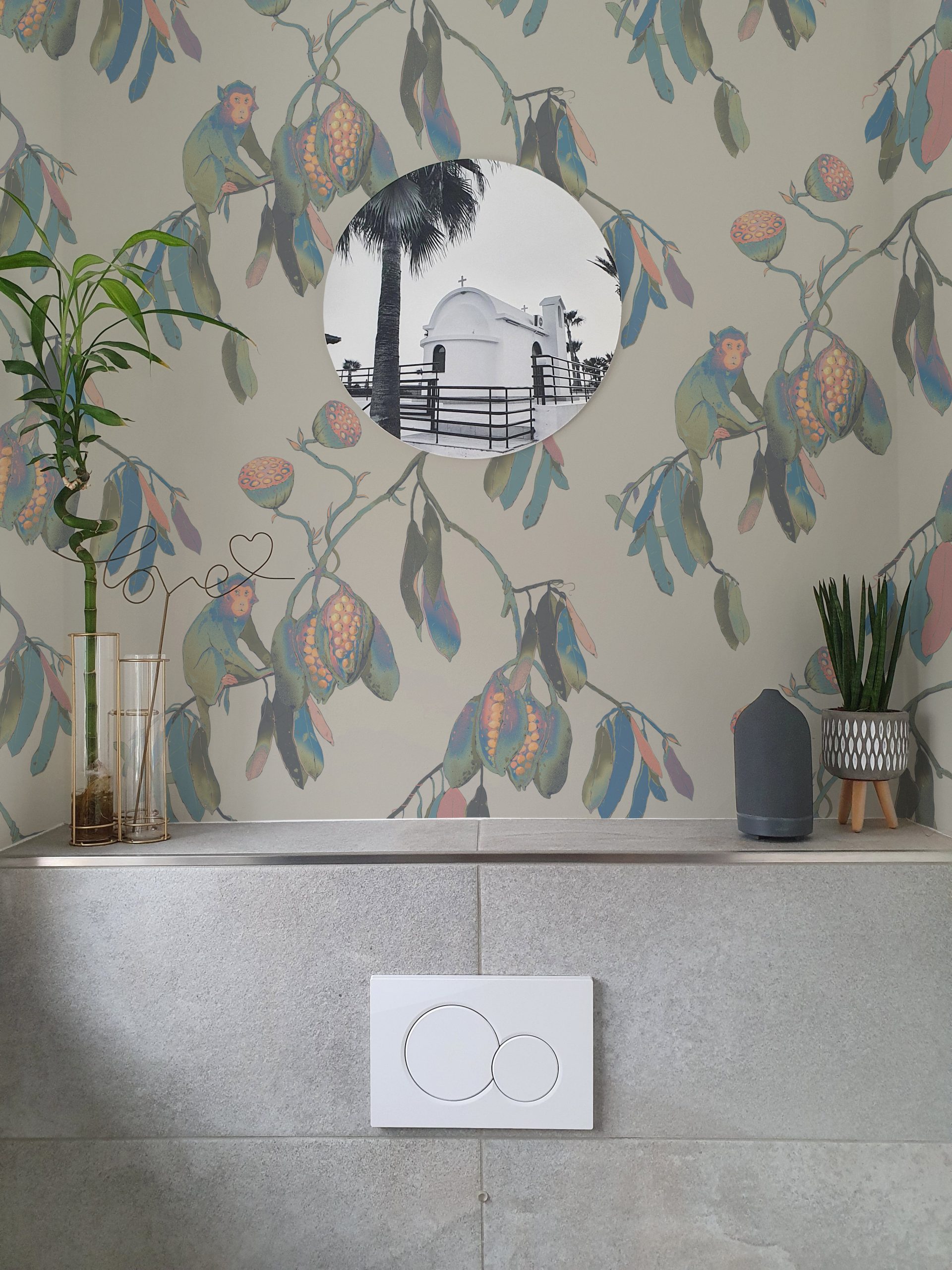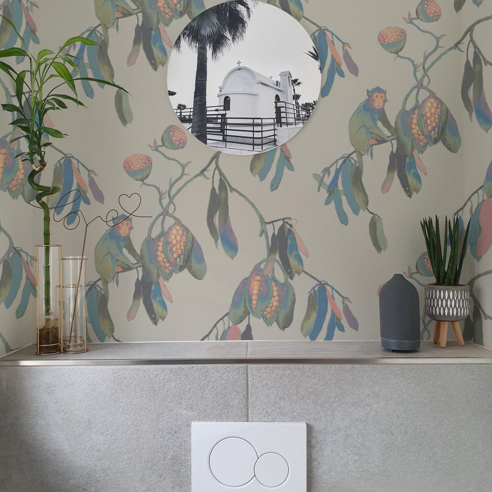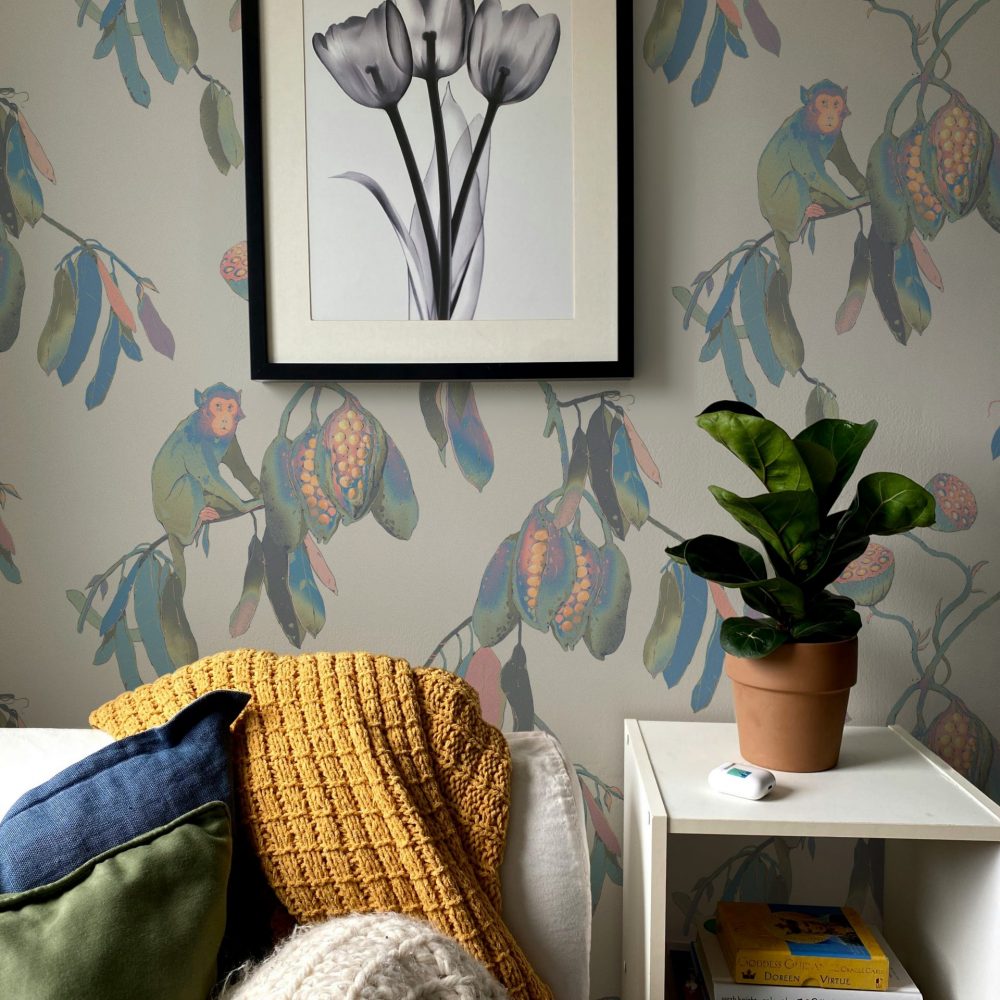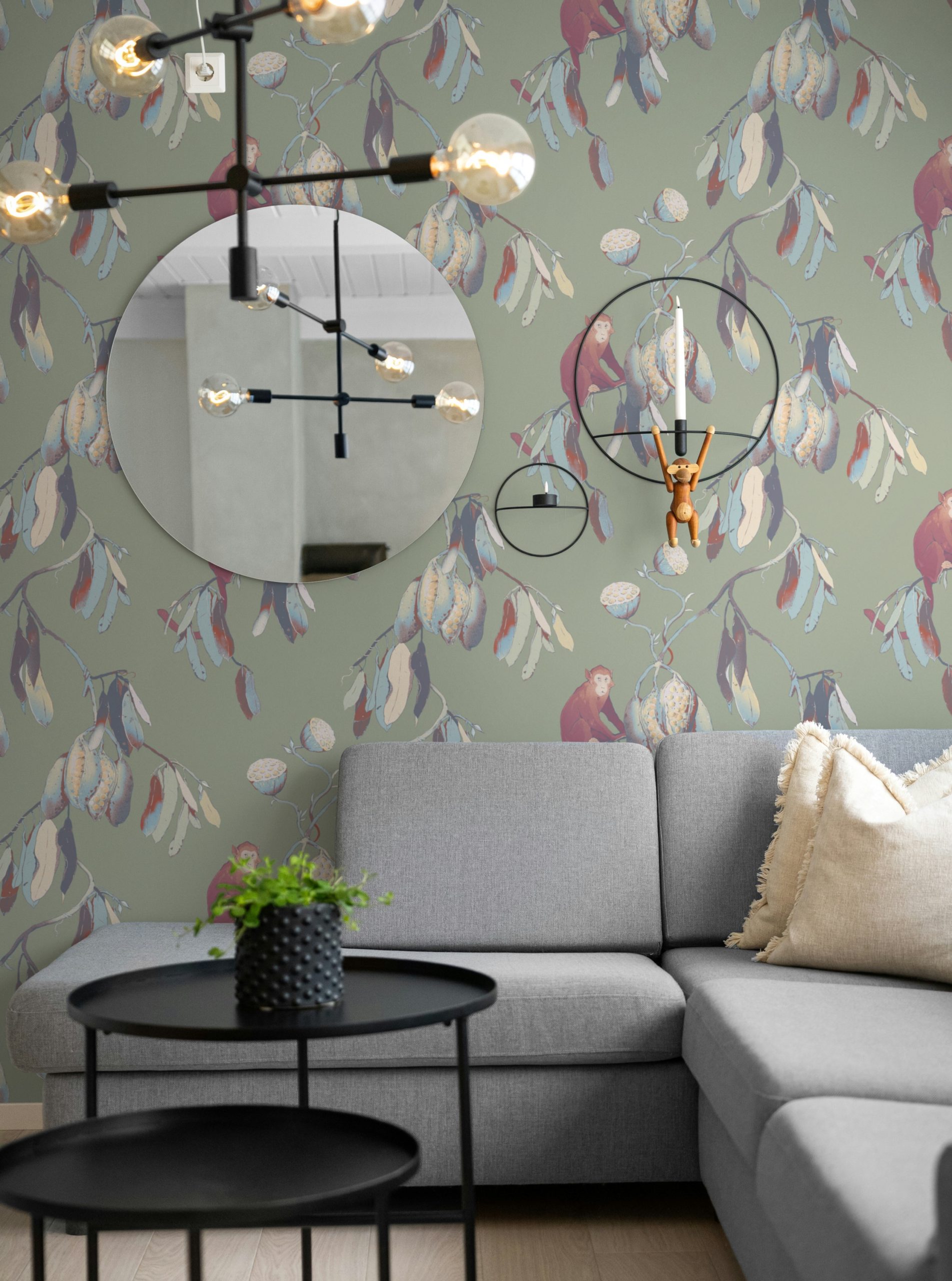Una vegetazione delicata dai colori polverosi punteggiata da scimmie da toni pastello.
